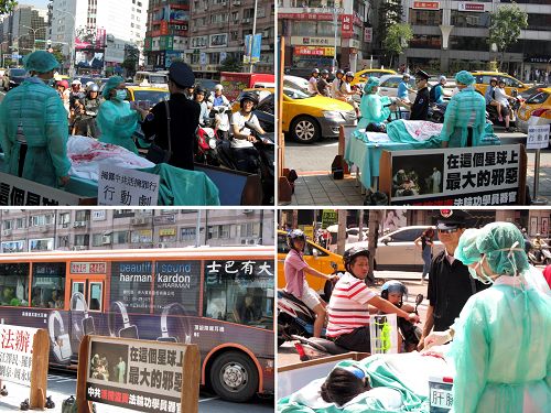 进入初秋的台北仍是摄氏三十多度的高温,艳阳高照下的街头不减盛夏的酷热,学员们顶着烈日,有些扮演医生、护士、公安和躺在手术台上惨遭杀害的法轮功学员,有些在广场上分发资料、讲真相征签。每个人都有不同的人生经历和修炼过程,但都抱有同样的理念和胸怀:把真相传递开来,曝光邪恶的血腥暴行,启发正义良知,守护人伦道德的最后底线免于崩坏和沦丧。