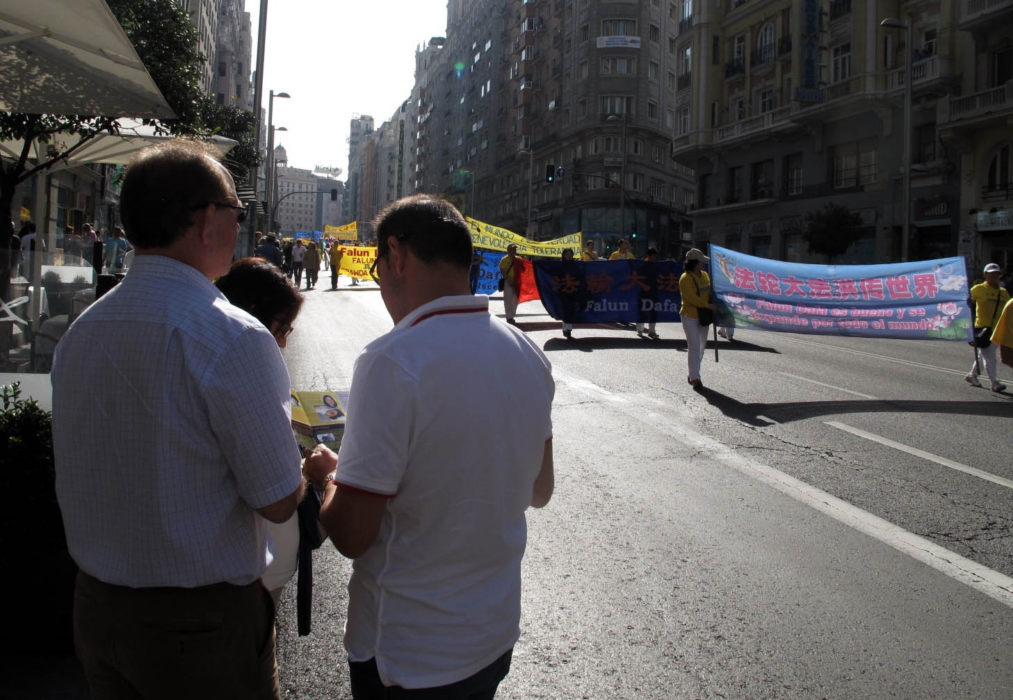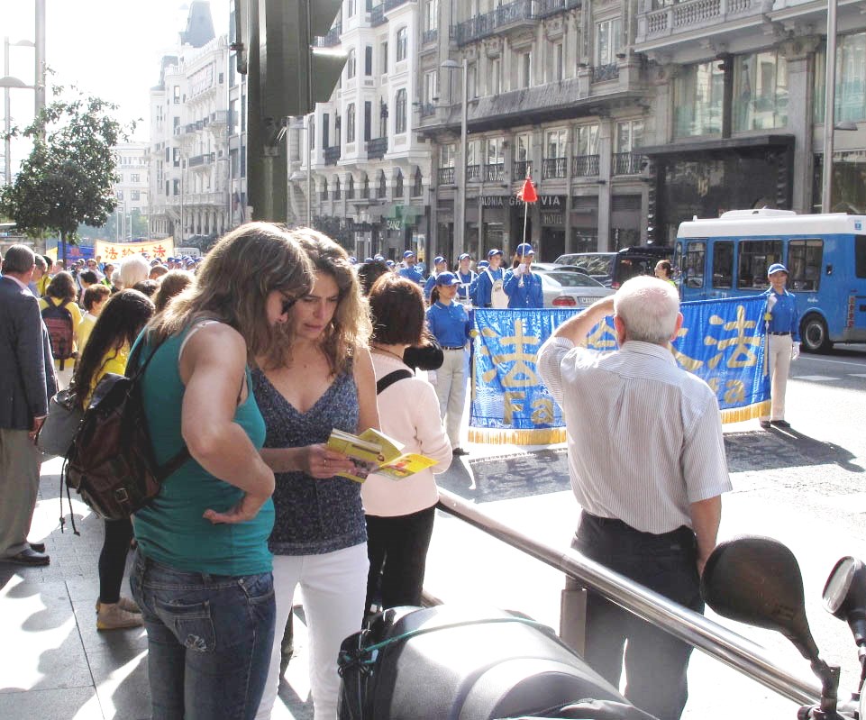 ![]() 图2:二零一四年十月四日,法轮功学员在马德里举行盛大游行,很多人接过真相传单,认真阅读 |