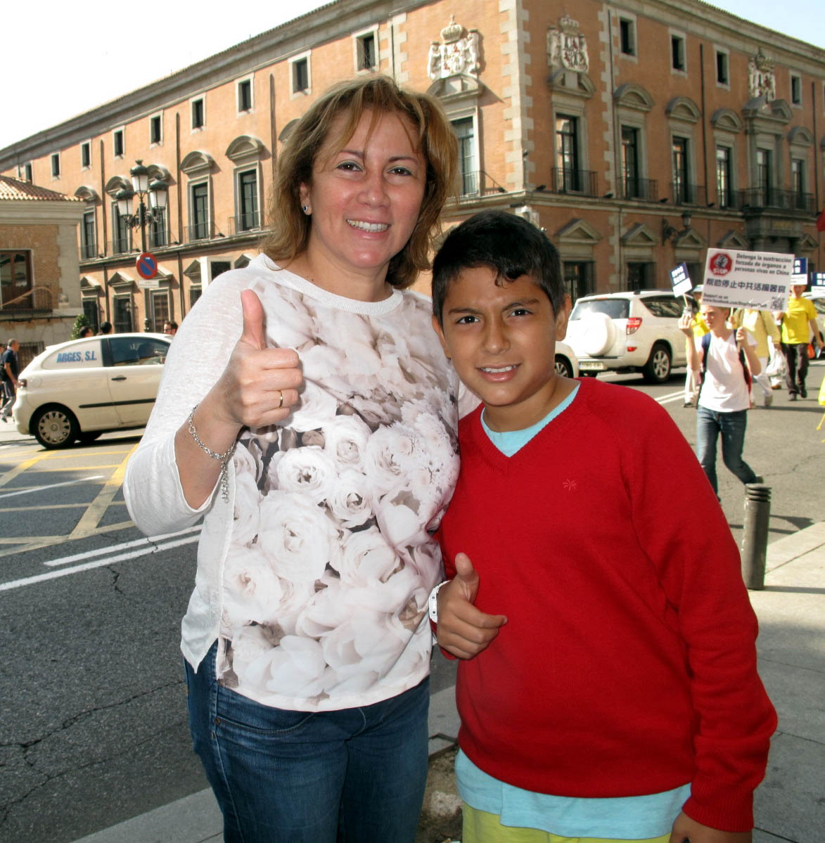 ![]() 图3:二零一四年十月四日,法轮功学员在马德里举行游行,一位小男孩和妈妈一起认真观看并用iPad拍摄游行队伍,伸出大拇指赞叹法轮功 |