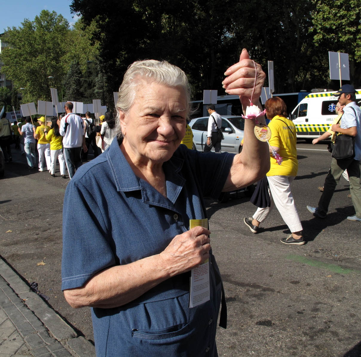 ![]() 图4:法轮功学员在马德里举行大游行,一位西人老太太站在路旁从头到尾观看游行队伍,照相时,她高兴地举起前面经过的法轮功学员送给她的手工莲花 |