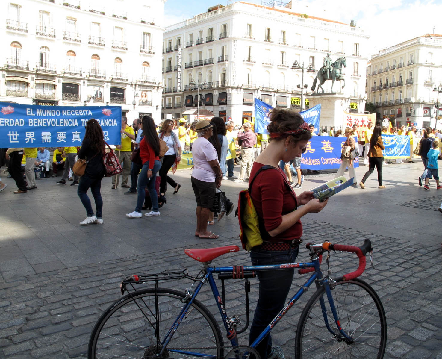 曾在大学教人类学的西班牙女士艾丽(Eli)十月四日下午骑车经过太阳门广场(Puerta del Sol),法轮功学员的反迫害集会吸引她停下车,接过一张传单认真阅读。她告诉学员,中共当局的人权侵犯令她震惊,活摘器官的确是反人类罪。