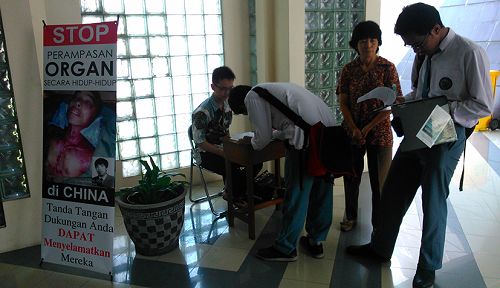 在三十分钟的时间里,法轮功学员们播放了《·九·评*共产党》的部分视频,同时配有印尼文字幕,许多与会者都被中共的邪恶所震惊。