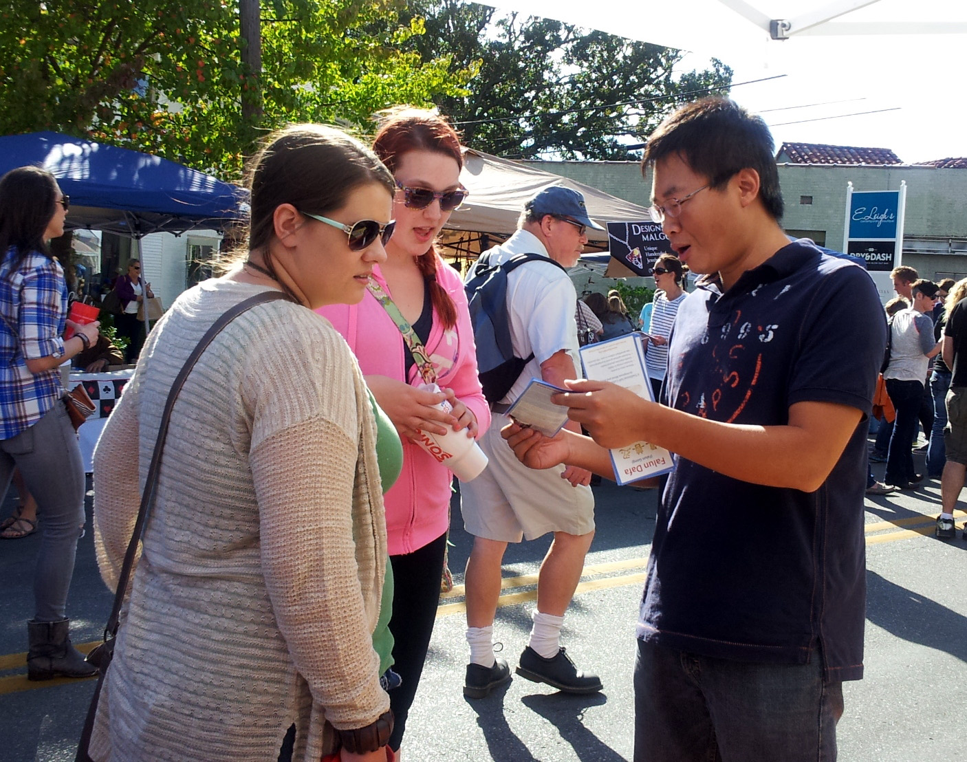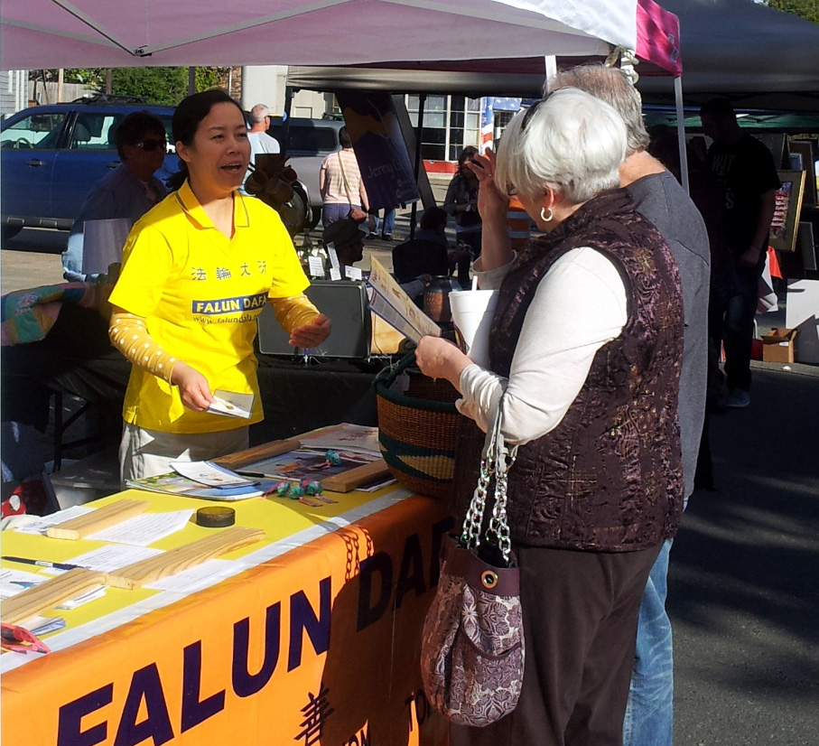 当天,参加节日庆祝的市民络绎不绝,不断有人在介绍法轮大法(又称法轮功)的展位前驻足,询问更多信息。很多人以为这是在推销一种健身的学习班,学员向他们解释:我们功法是免费教功,所有的法轮大法资料都可以网上免费下载。有学员以自己的亲身经历补充介绍:以前自己得了眼疾,医院束手无策,通过炼功好了。类似这样的例子千千万万,他只是其中的普通例子,这就是为什么他(作为一个义务人员)站在这儿的原因。