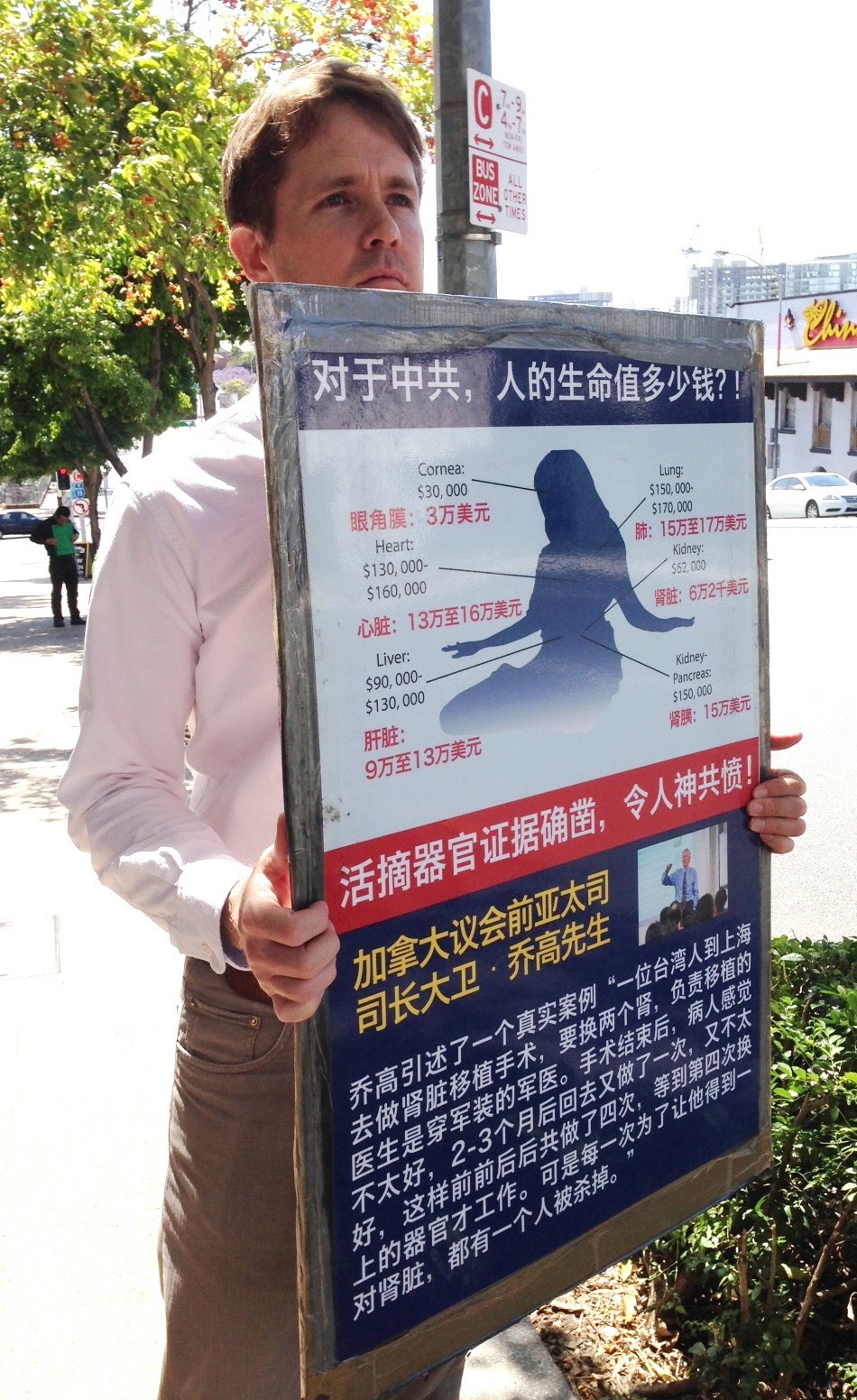 ![]() 图2:西人法轮功学员史密斯(Ben Smith)在中国城举展板,揭露中共活摘器官的黑幕。 |