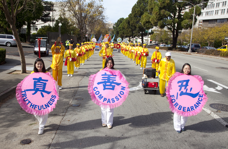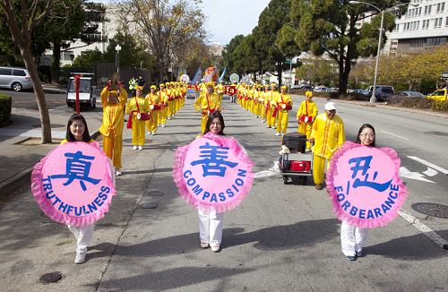 法轮功学员制作的巨大的花车上,学员们舒缓地展示五套功法,向人们传递着“真、善、忍”的美好信息。有的旧金山民众看后感慨地对法轮功学员说:“今天是你们的日子,是你们的游行!”一位西方老先生接过真相传单后表示:“我支持法轮功已经有十几年了。”