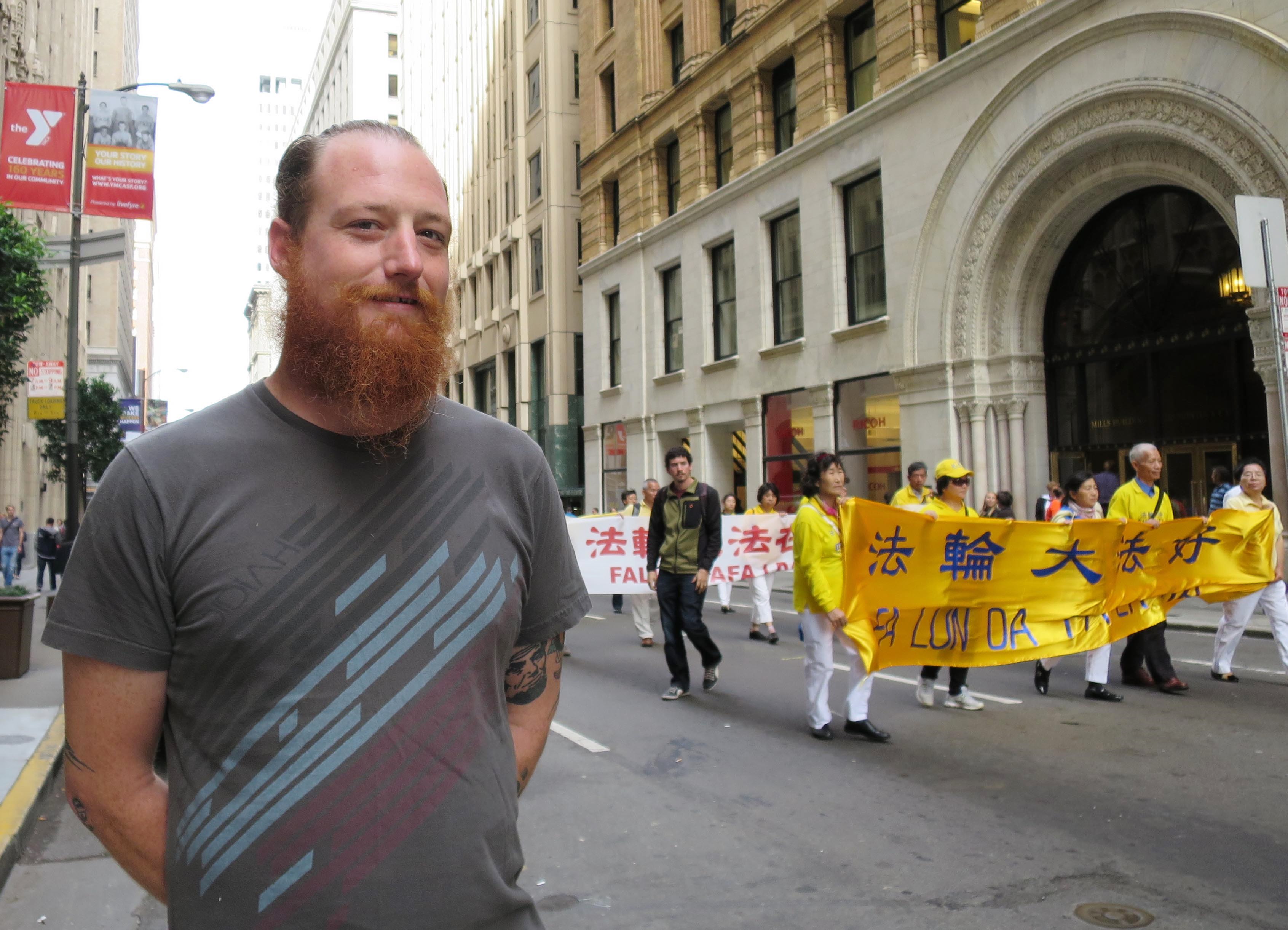 在咖啡店里工作的Jason Shenheig说:“天国乐团的演奏真是太棒了!他们一边走一边演奏的过程真是太奇妙了。以前没有听说过法轮功,很高兴今天见到法轮功的游行。”