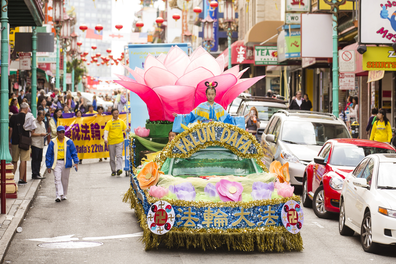 一位七十多岁的老先生,在游行前用手机拍摄法轮功学员大炼功的场面和“法轮大法好”花车装饰的过程。法轮功学员递给他一本真相小册子,他看了看说:这本已经看过了。老先生是广东台山人,来旧金山已经几年了。他表示对法轮功的真相都了解,对共产党的谎言根本不相信。他说,锻炼身体炼炼功有什么不好?“真、善、忍”对谁都有好处。