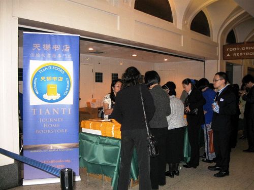 一早六点多钟,学员们就开始进场了,一进大厅就看到了两边摆着精美法轮大法著作的“天梯书店”分中英文设立的两个摊位。两个摊位都挤满了买书的学员。有帮亲人好友买的,有帮同事买的,有给有缘人买的,也有给自己买的……书店的工作人员忙得不亦乐乎,尽心满足大家的需求。