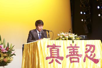 明真在法会发言时谈了他刚来澳洲的两年多时间里,如何跟随大人一起在平台上打真相电话的体会。他谈到:“那段时间,每天放学,周六、周日,我都必定去平台上与全世界的同修一起拨打真相电话。那段时间,在学校,我突破了自己的怕心,让老师们都填了(反迫害)征签表,并送给他们介绍神韵晚会的光碟,他们都表现的很开心。在师父的加持下,我的英文水平飞快的提升。那时的我,在师父的呵护下,平稳的走在修炼的道路上。”