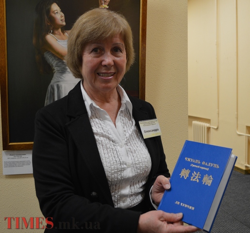 ![]() times网站的图片报道:美展导游正在介绍《转法轮》一书 |