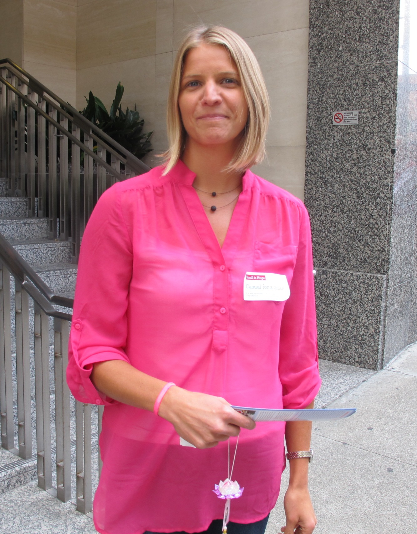 “这是一个非常好的讲清真相的方式,我们一直站在那儿看队伍过来,我能看到那些路人也非常震撼,有的人也在那儿站很久,一直看。我当时并没有带传单,但我穿着写有‘法轮大法’字样的衣服,就有人主动过来问我,了解游行本身,了解真相。而且游行经过最主流的街区,我本身也在金融区上班,这真的是在给主流社会展现。之前看到明慧网的报导,也知道游行,但是今天在现场的感受完全不一样。”