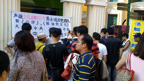 一天,在“大三巴牌坊”法轮功真相点上,因中午时间人群略稀疏。成团的游客过后,来了几个身材高大的北方中年人。他们认真地看着有关法轮功的真相图片,时而互相交谈。当看到亡党石时,他们低声自语:“这会是真的吗?真的会允许它存在吗?”