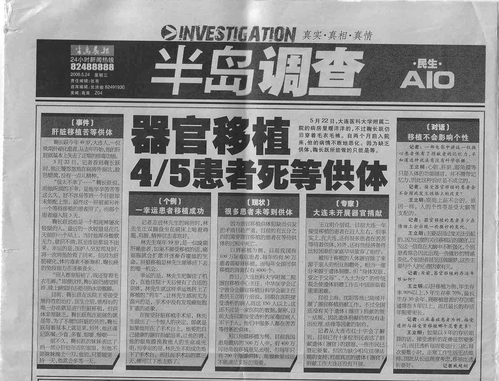 《大连晚报》2006年12月30日以“同一医院成功换肾三例”为题目,也报道了此事。