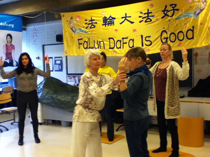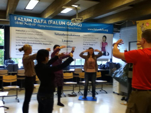 ![]() 赫尔辛基精神健康博览会上,参观者学炼法轮功 |