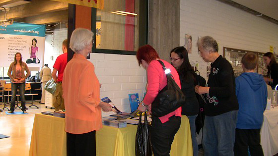 很多博览会参观者对法轮功感兴趣。法轮功学员现场教功。教室里经常站满了人,有的不得不留下来排队,等着学功。法轮功学员不间断地教,以便尽可能多的人能够获得机会学习法轮功的五套功法。
