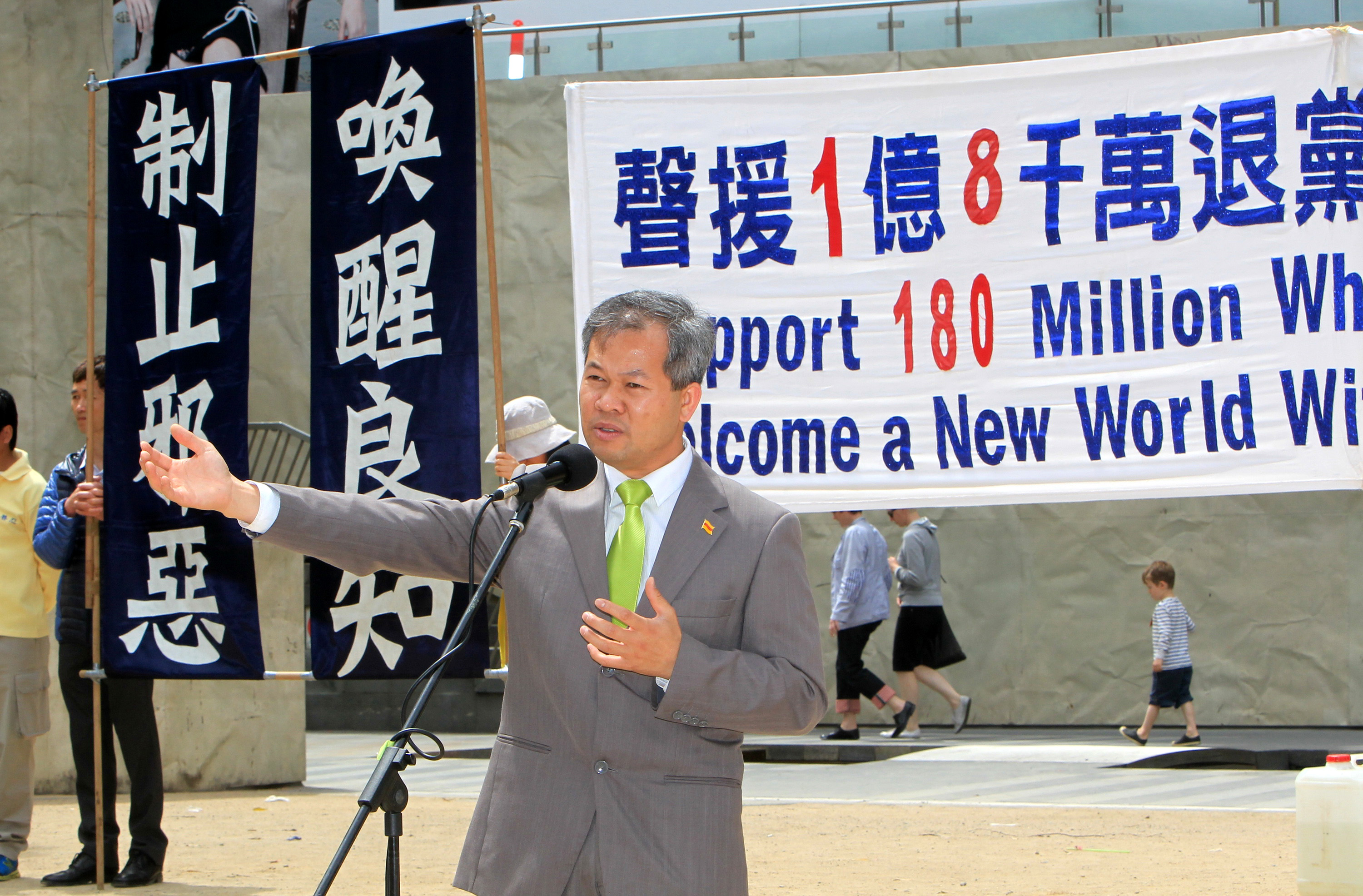 《天安门时报》社长兼总编、中国民主党(澳洲)主席阮杰先生在发言中表示:“中国政府的腐败、环境的污染等一切社会问题都是由中国共产党、中共的专政造成的。信仰对于中国非常重要,就象法轮功,他们坚持真、善、忍,弘传全世界,但只有共产党不能容许人们拥有信仰的自由。因此我们必须认识到,只要共产党专政一天,我们就不可能拥有美好的国家、良好的环境,更不可能在中国享受到平等和公正。在这里,我告诉大家,特别是中国人,如果你是一个善良的人,请退出中国共产党。如果你爱中国,请退出中国共产党!”