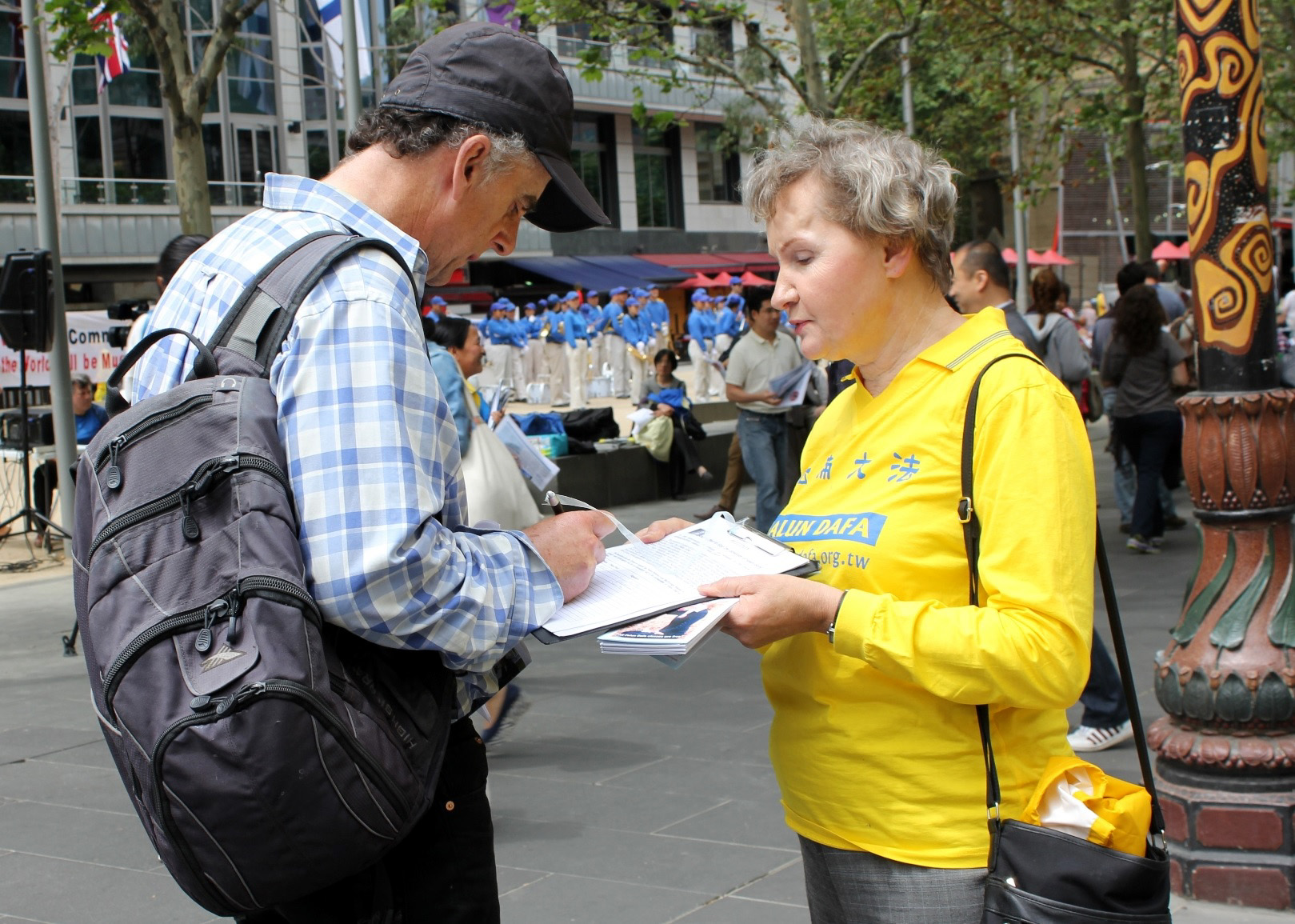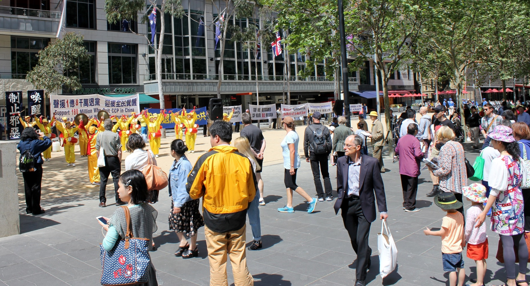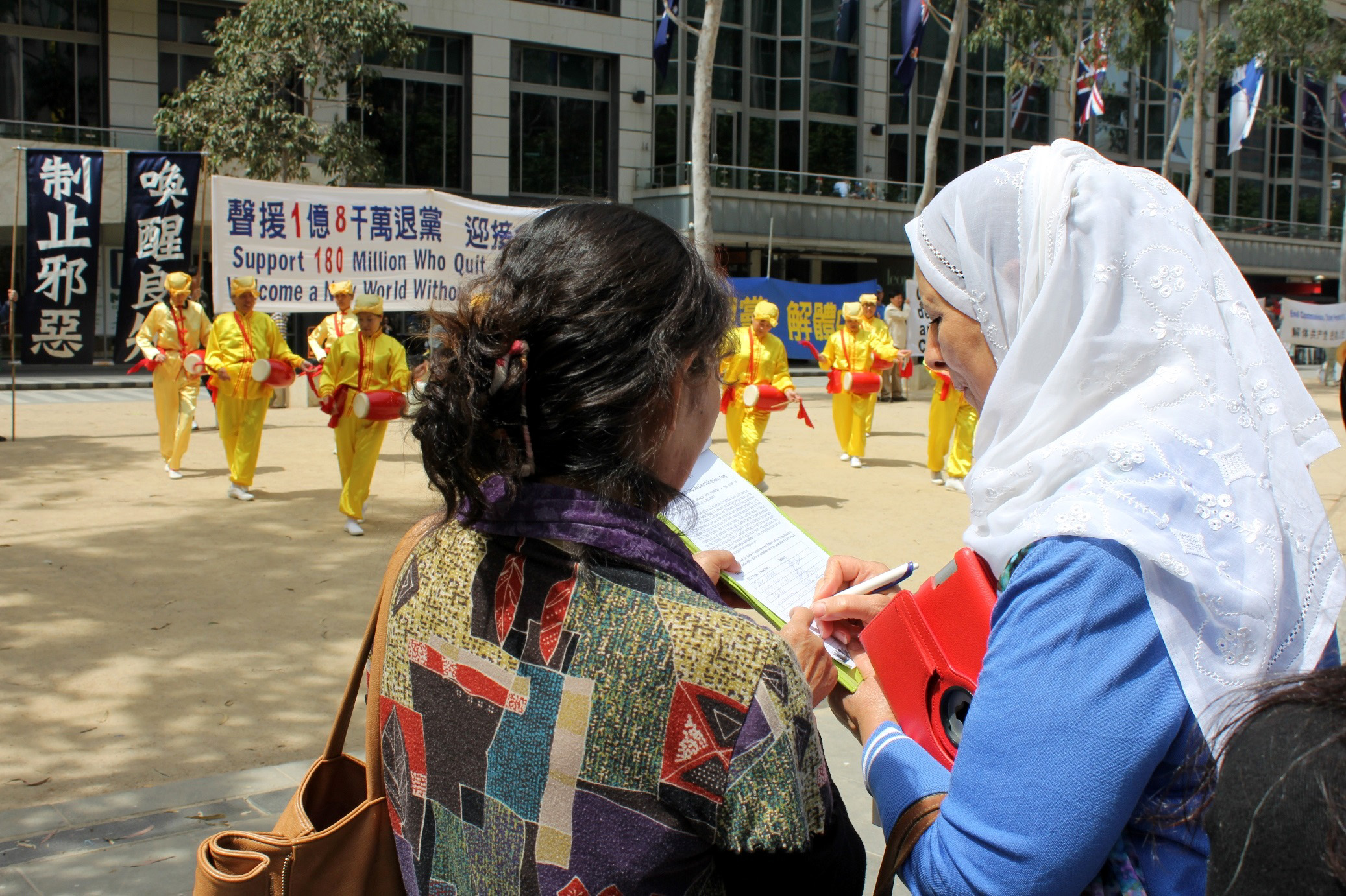 集会于下午十二点三十分开始,墨尔本法轮大法天国乐团首先演奏了《法轮大法好》、《法鼓法号震四方》、《法轮圣王》等曲目,响彻广场的鼓乐、雄壮的旋律令人振奋不已。听了嘉宾的发言,看了退!党!义工发放的资料,明白真相后的世人纷纷签名,呼吁制止迫害。