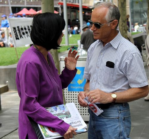 墨尔本市民多米尼克(Michael Dominick)先生非常支持法轮功,他说:“大约在两年前,我拿到一份法轮功真相报纸,内容让我感到很震惊,于是我就开始在网上搜索研究这方面的内容,发现报纸上说的都是真的。从那以后,我时常和朋友们谈论这件事情,给他们《·九·评*共产党》光碟或册子,还有报纸,告诉他们真相。中国共产党一直在压迫人 民,不给人民任何宗教信仰自由,没有任何媒体自由,一切都在监控或审查之下,这真是太荒谬了,我们需要尽快制止这些恶行。”