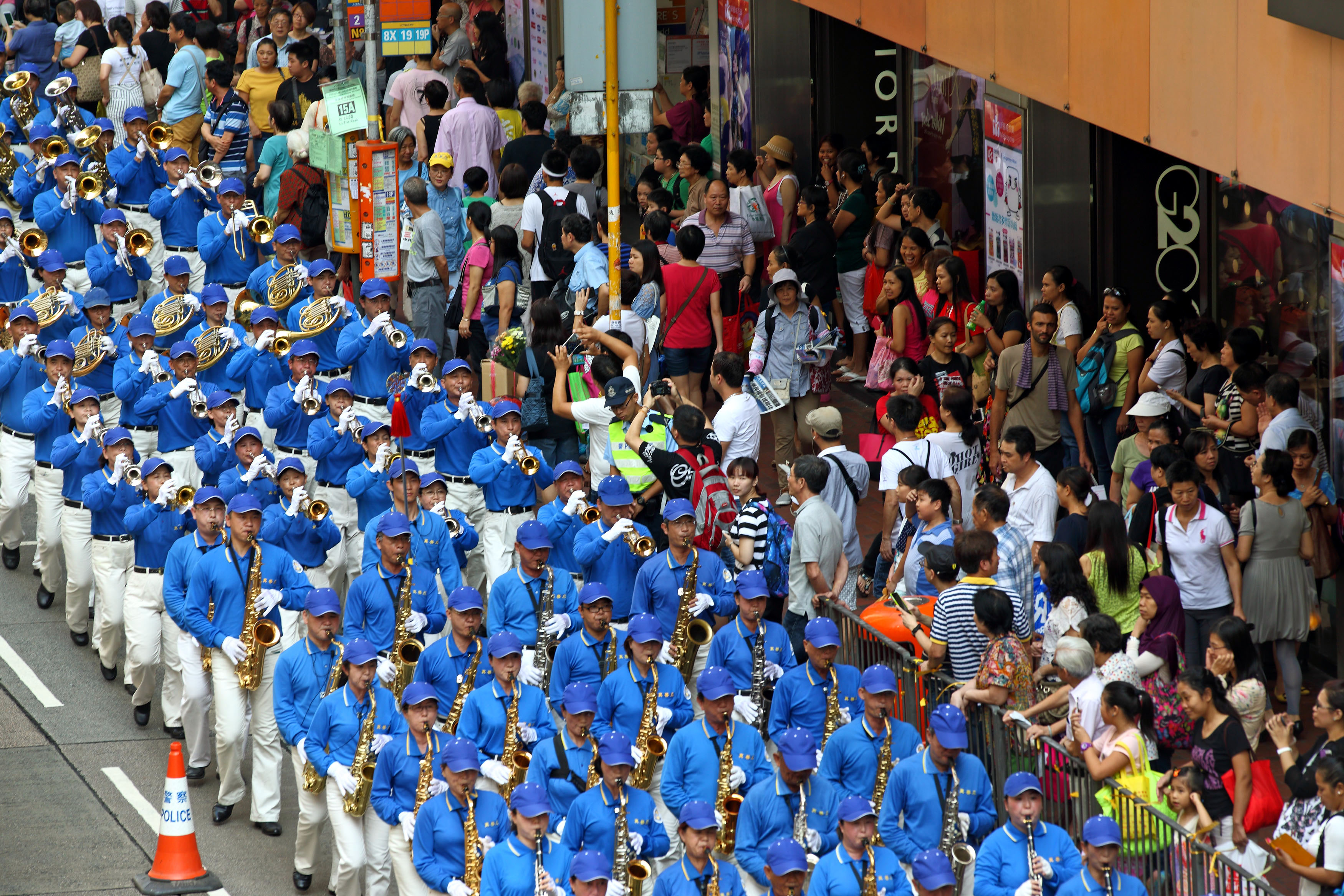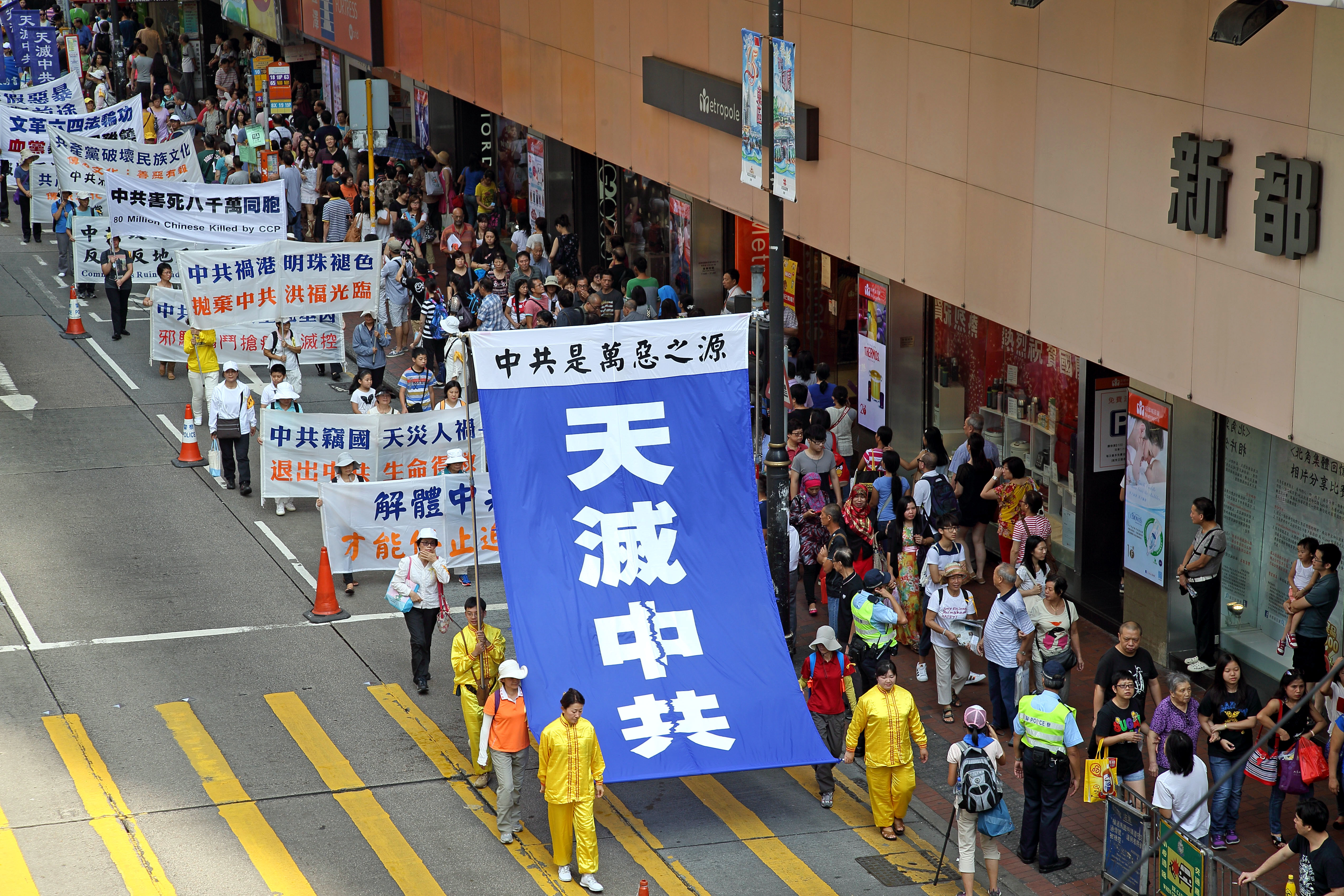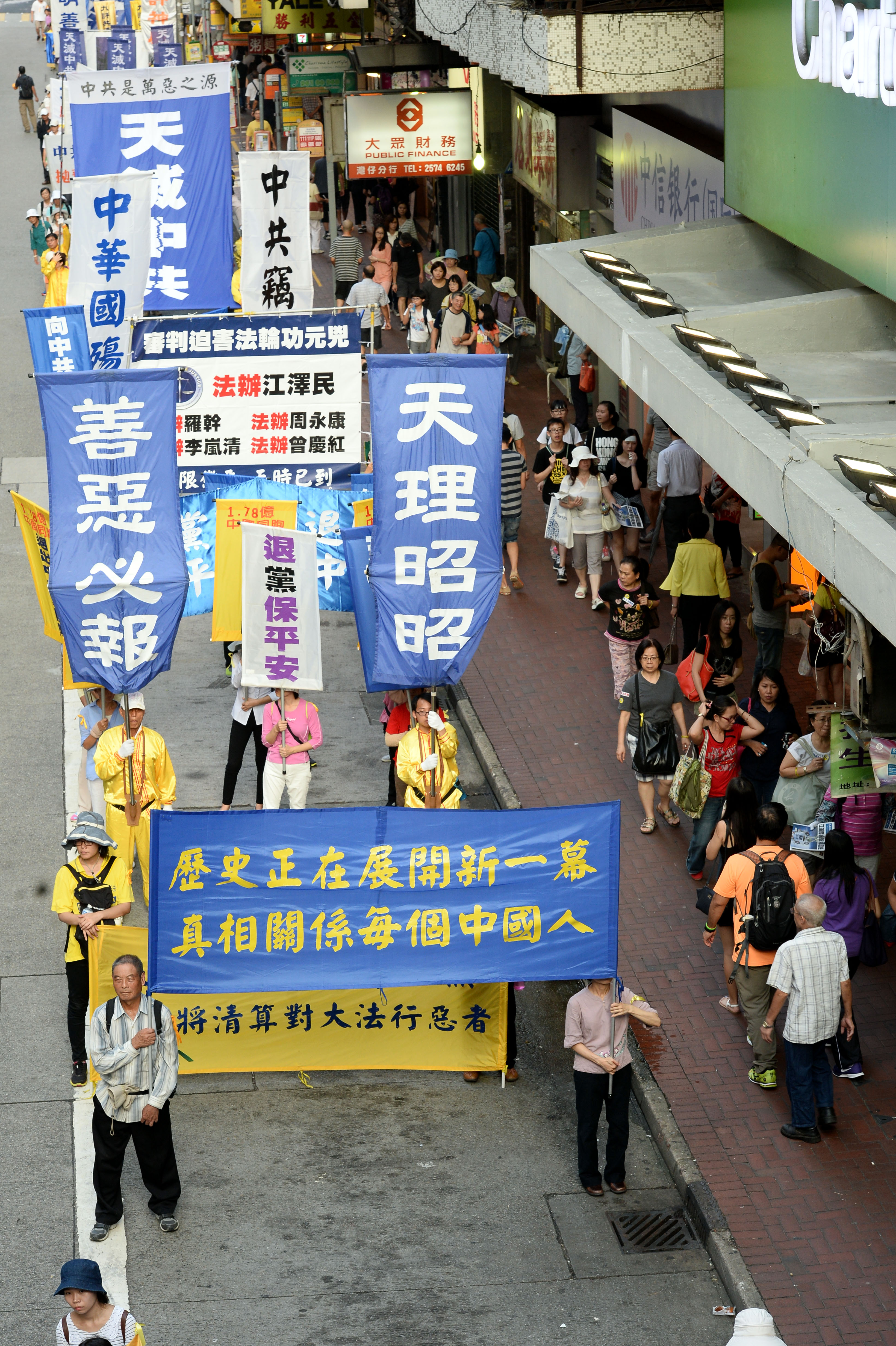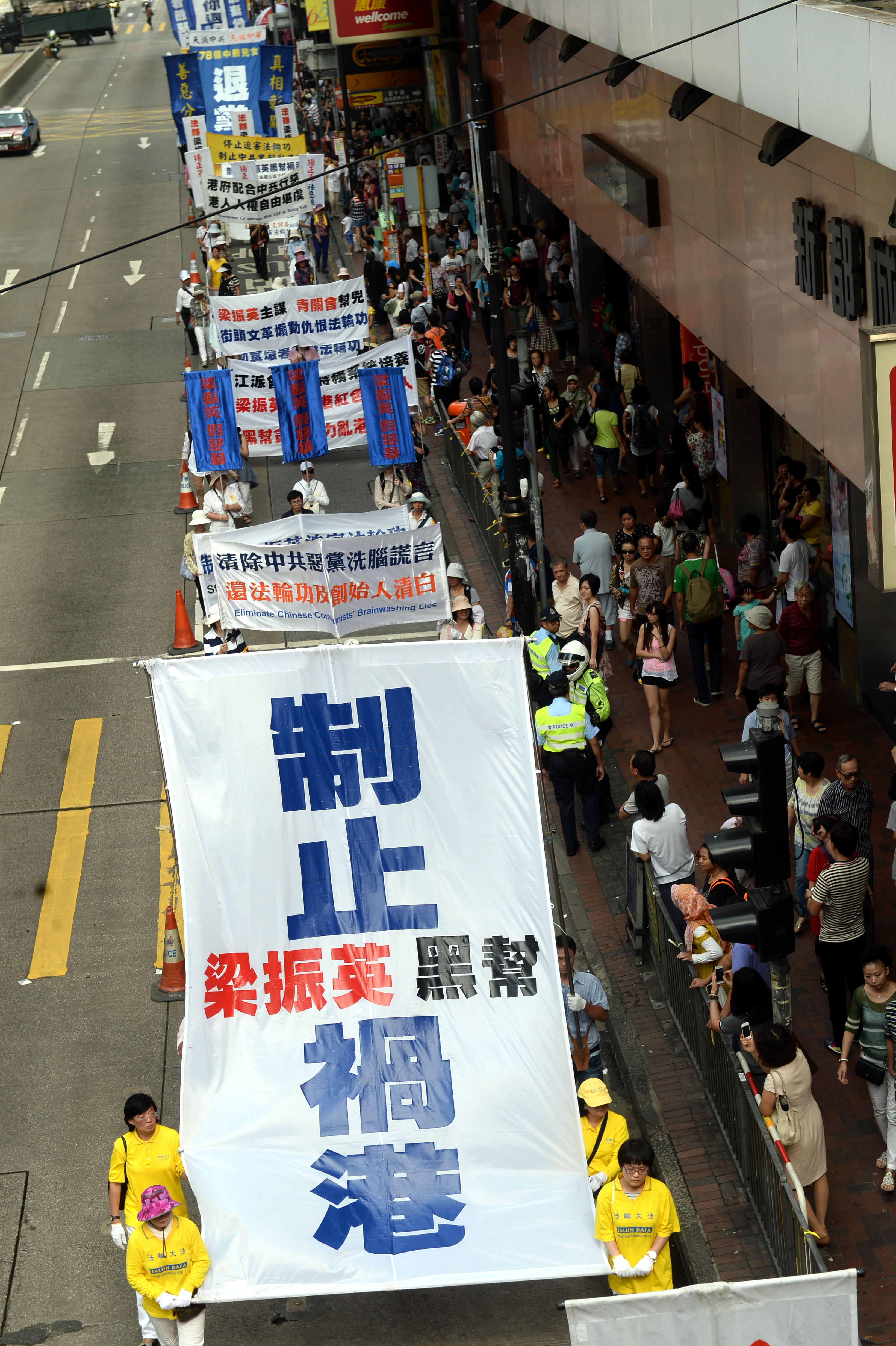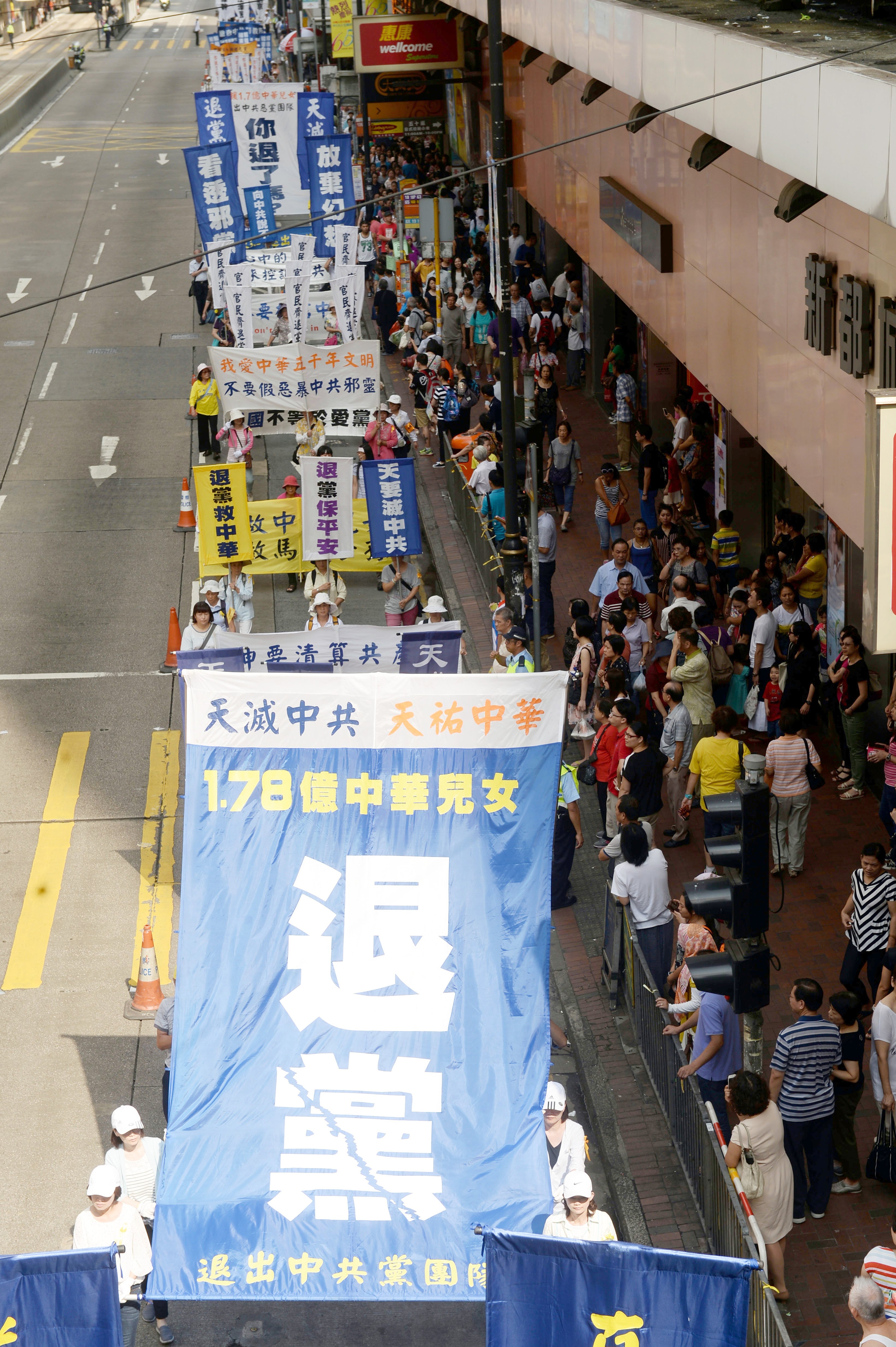 集会后,盛大的游行队伍在天国乐团的引领下,途经铜锣湾、湾仔和中环,前往终点中联办。