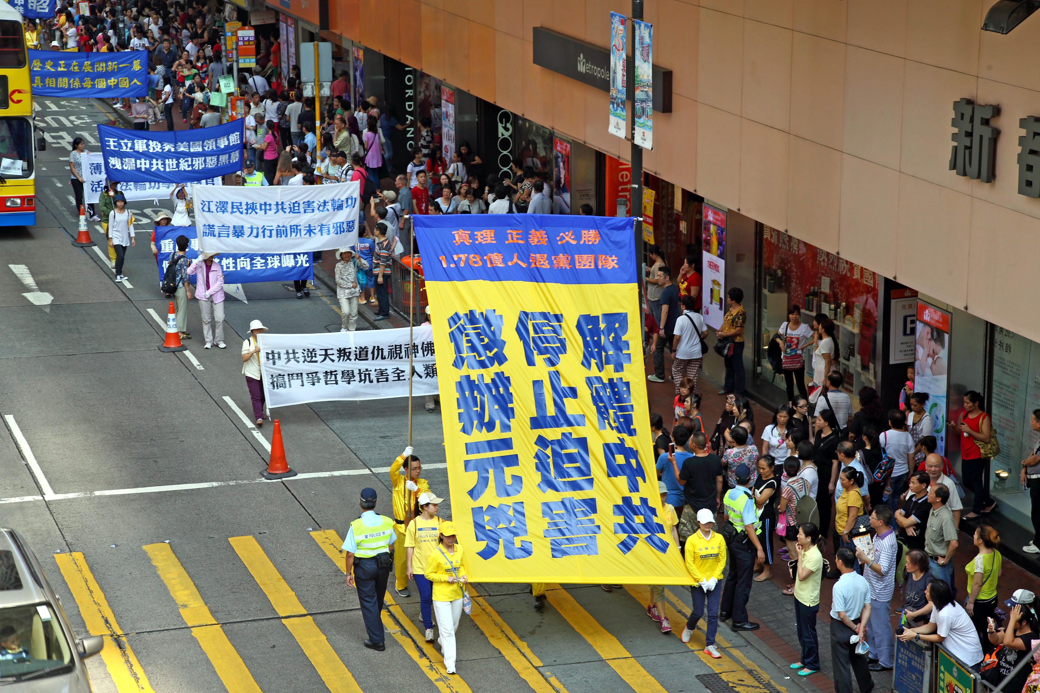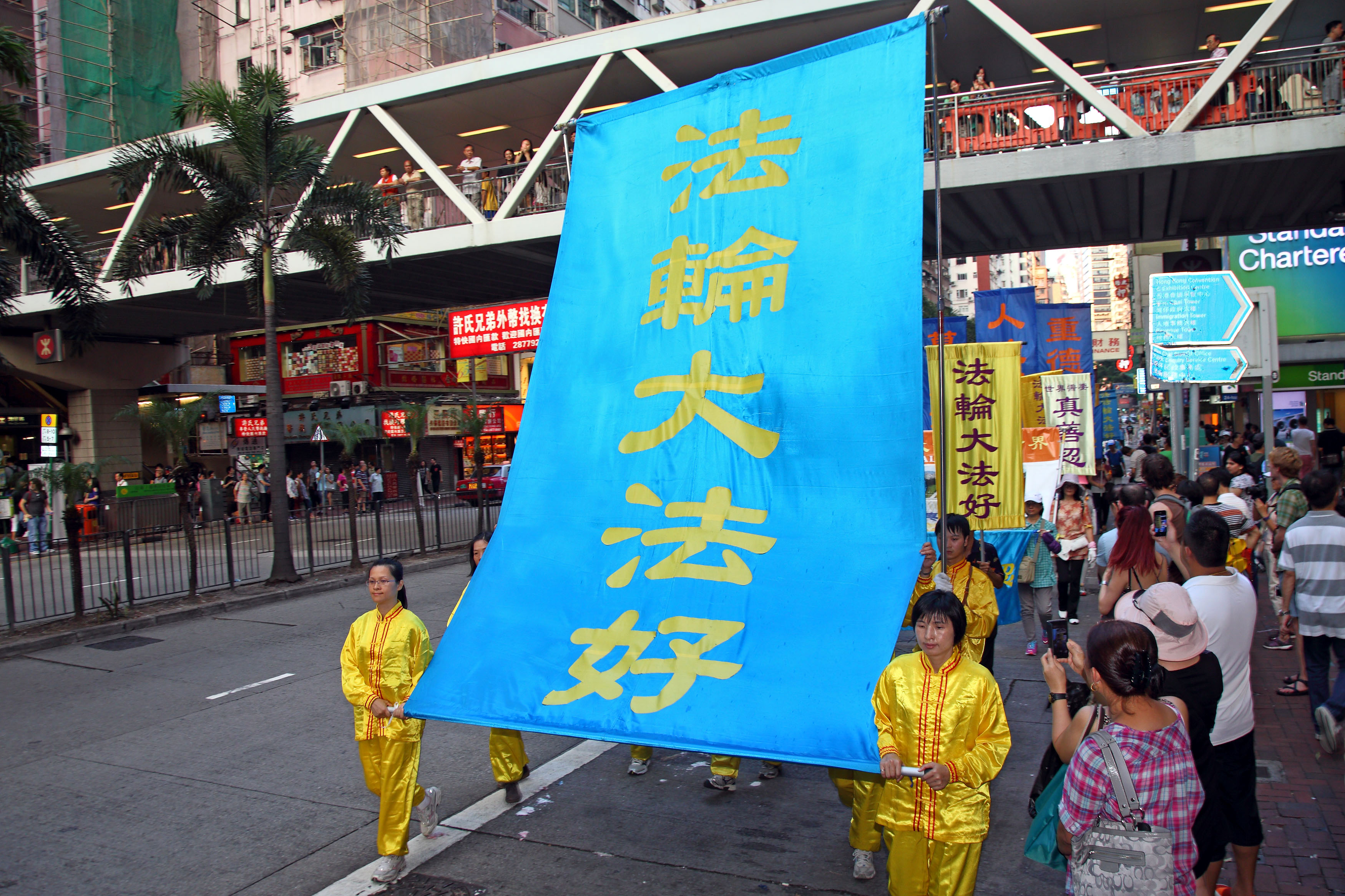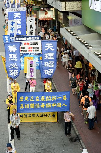 ![]() 图7-11:香港法轮功学员二零一四年十月一日举行游行,队伍途经多个闹市区,吸引不少市民驻足观看。 |