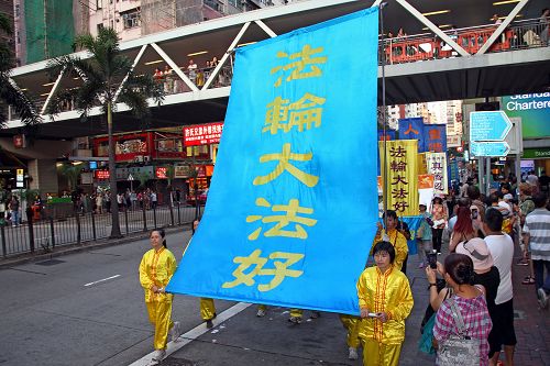 另一位与妻子一起来港旅游的中年游客,一直看着游行,虽然妻子一直不让他接受采访,不过他仍回头告诉记者,他支持法轮功,并且说知道事实是怎么回事。