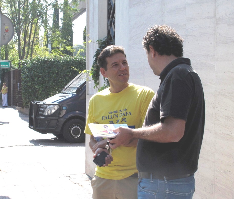西班牙诉江案律师卡洛斯(Carlos Iglesias)先生面对中使馆发出正义呼声,他特别呼吁中使馆工作人员认真倾听国际社会,包括欧盟对中共大规模活摘法轮功学员器官反人类罪行的严正谴责,呼吁法办江泽民等迫害法轮功的元凶。