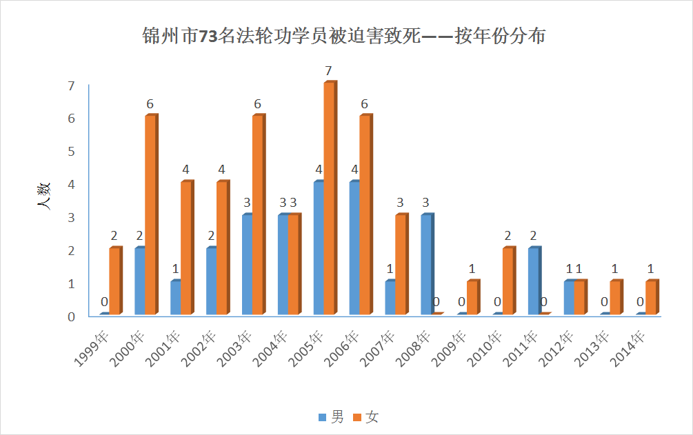 一九九九年至二零一四年,锦州市被迫害致死的男性和女性法轮功学员按年度分布情况如下图: