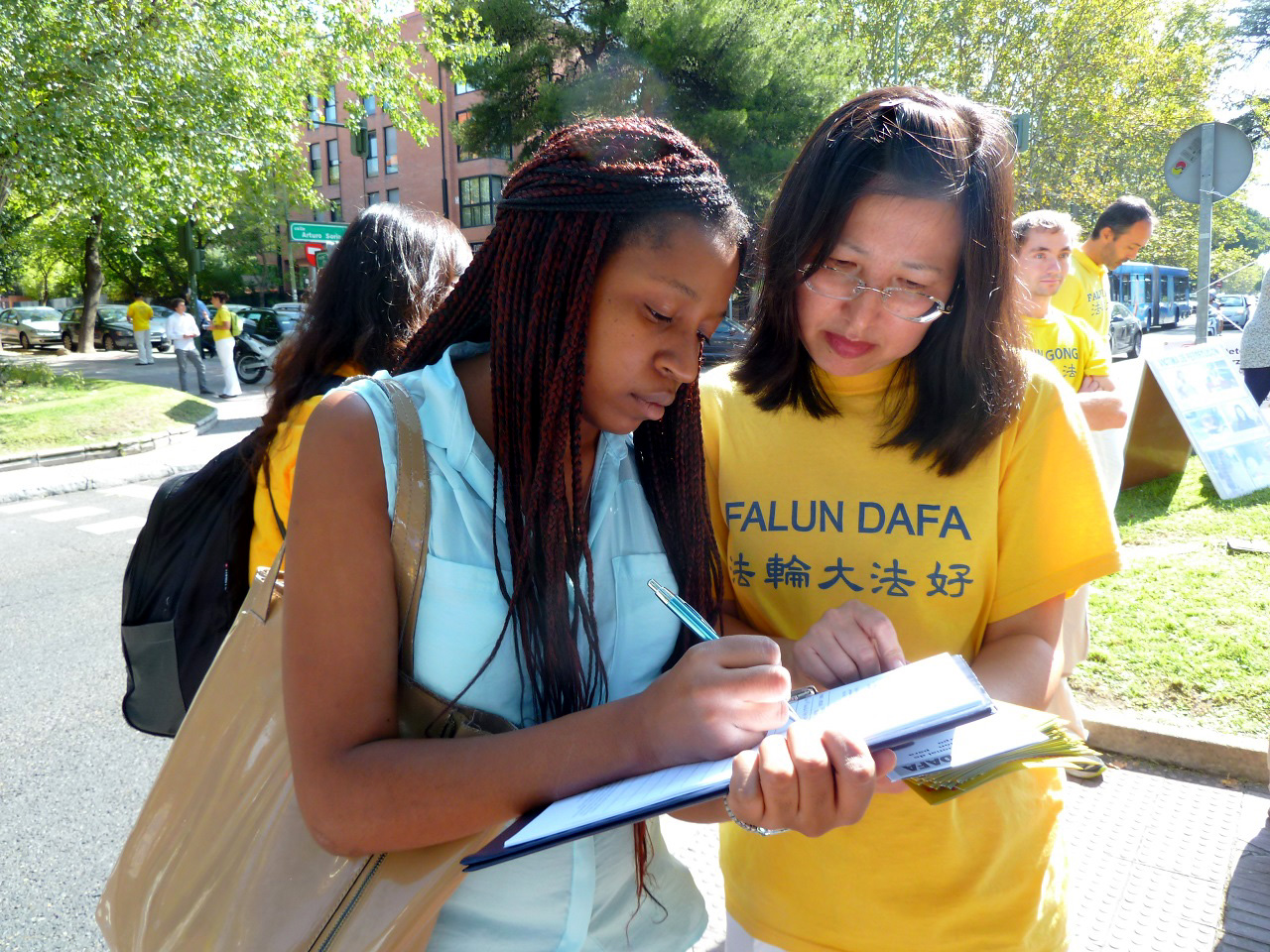 Glokia Maria Nduka Borico 是一位法律系的大学生,她路过活动现场时听到了这些事实,比一般人更了解法律方面知识的她,知道这个问题的严重性。她签名后说:“以前我不知道发生这么邪恶的事情,只知道中国现在经济发展的很快,却不知道在中国法轮功学员遭受到如此可怕的苦难。活摘法轮功学员器官这件事情应该让更多人知道,很重要。每个人都应该签名反对中共活摘法轮功学员器官这样的罪行。当全世界人都知道这个真相的时候,就会给中共施加巨大的压力,制止这场迫害。应该让所有的人具有信仰的权利。我要签名支持你们,反对迫害。”