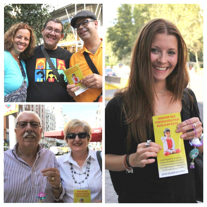 一对华人夫妇带着孩子和他们的朋友一起高兴地看着游行,女子问道,这是西班牙的法轮功学员吗?当她知道是来自欧洲各国的部分法轮功学员后感叹道:“很震撼!声势这么强大!”他们也知道中共活摘法轮功学员的罪恶,和周永康事件,中共官员腐败,最后同意三:退.(团队)选择美好的未来。