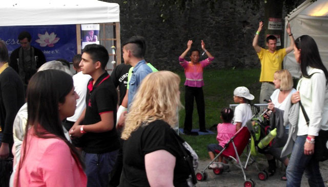 过往行人对法轮大法祥和的功法饶有兴趣,纷纷询问如何学功,得知炼功点上免费教功时,他们都很惊喜。对用“真善忍”来指导自己日常生活的人们却因此而在中国遭受迫害,善良的德国民众感到难以置信,听说中共活摘器官的消息时,人们更是震惊和愤慨!