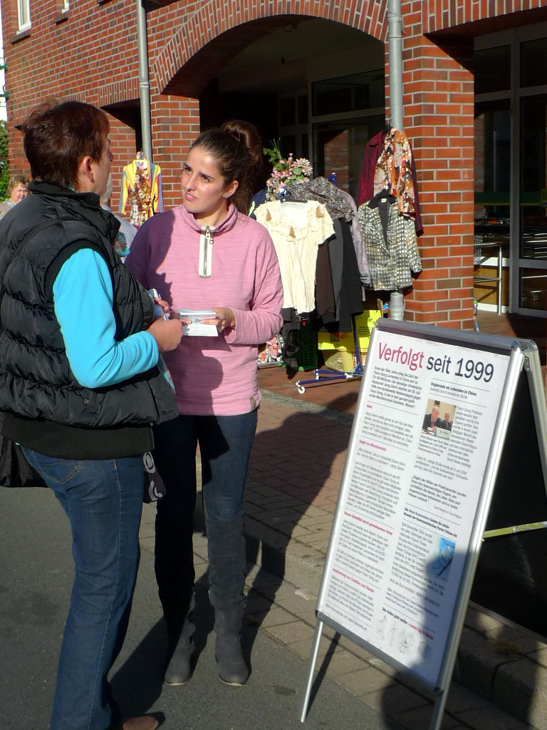 奥斯特罗尔茨-沙尔恩贝克(Osterholz-Scharmbeck)的收获节是那一地区最大的民间节日之一。法轮功学员于九月二十八日参加了这一节日。一年中最大的跳蚤市场正巧也在这一天,连本来是车道的主街都为熙熙攘攘前来逛街的人群而让道。