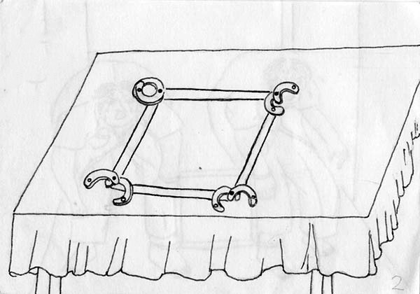 “架子”是用拇指粗的钢筋焊成的梯形框架,上面二十公分宽,底下三十公分宽,高度在三十公分左右,然后把一副手铐从中间断开,分别焊在铁梯形的上面两个角上,用于固定被害人的两手,再把一副脚镣从中间断开,焊在铁梯形的下面两个角上,用于固定被害人的两脚。