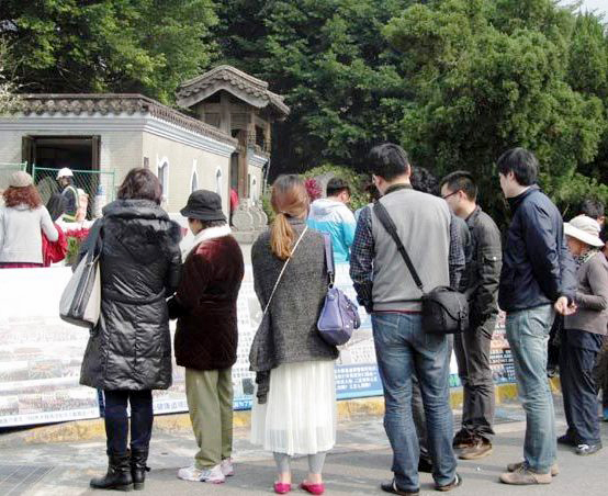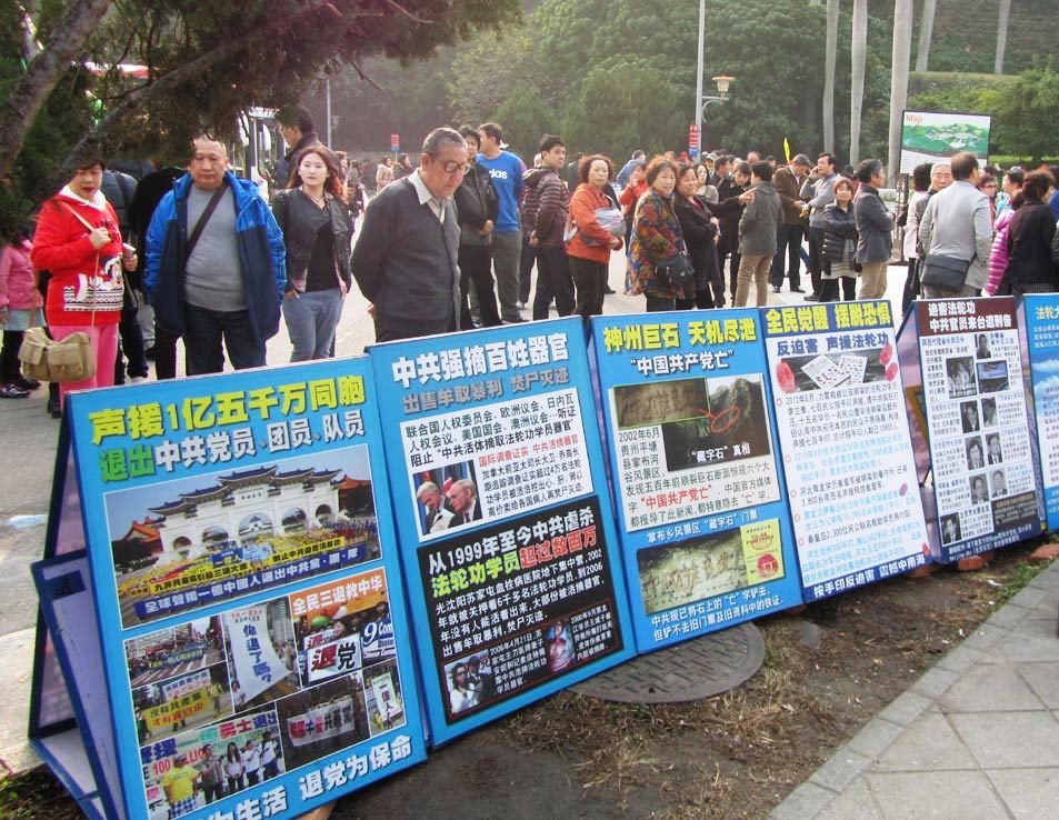 另一位轮值的学员早将展板整齐摆列好,展板面前挤满了大陆游客听、看真相,导游说:我知道飓风天故宫休馆,可是这些旅客都是今天晚上就要搭机离台,他们要求无论如何也要到故宫拍个照也好。这天,这两位学员忙得不可开交,转眼间就协助三十几位大陆游客办了三:退.。