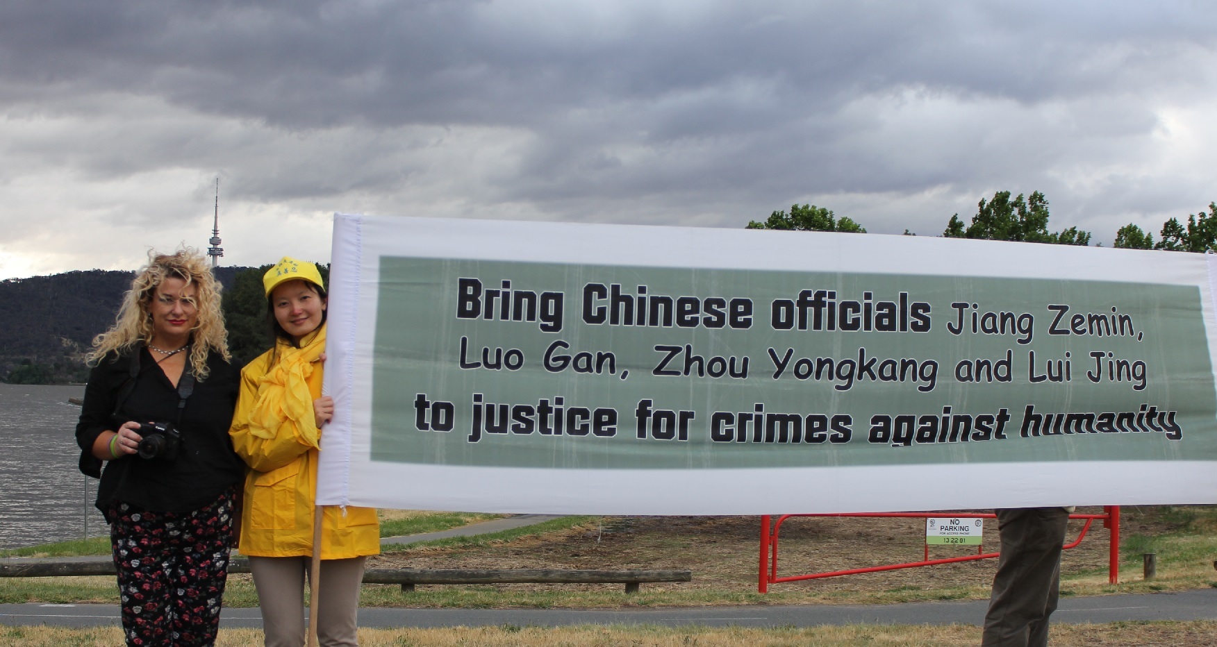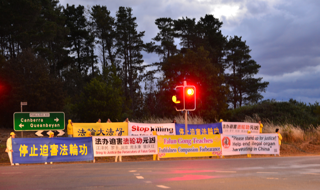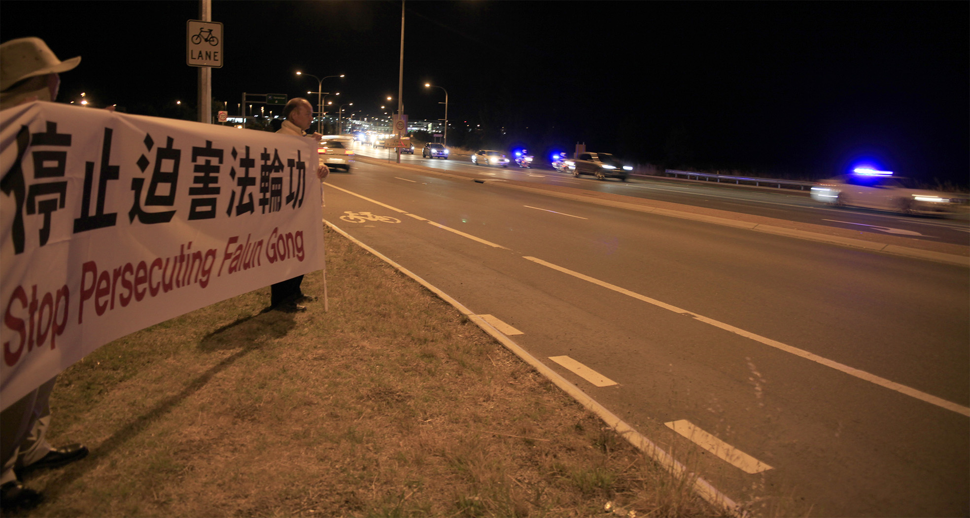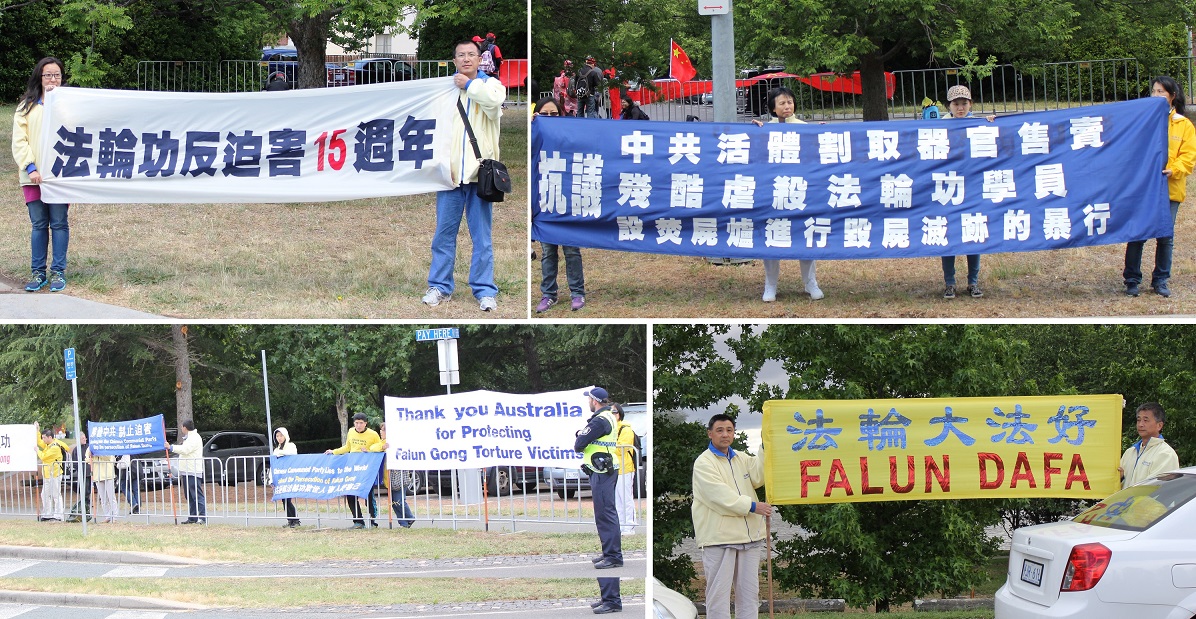 峰会结束的当天,二零一四年十一月十六日,习*近*平访问澳洲抵达第二站——首都堪培拉,在他入住的凯悦酒店(Hyatt Hotel)周围和车队必经的路口,来自澳洲各地的法轮功学员举行和平反迫害,得到了民众和堪培拉警方的支持,“法轮大法好”、“法办迫害元凶”(江泽民)等横幅,再次清晰的展现给当晚抵达的中共国家主席和随行团队。