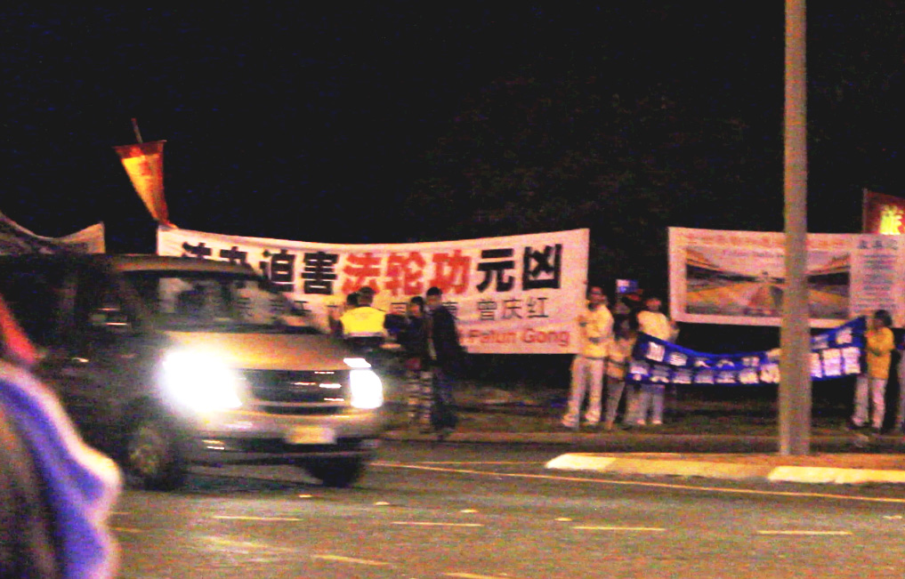 晚九点三十分前后,当习*近*平的车队快要接近酒店,一位警察站到了隔离栅栏之后的法轮功学员和留学生之间,保护学员。车队经过时,留学生故意挤撞学员,并拉扯横幅,被警察制止。当三个学生分别伸出血旗试图遮挡法轮功横幅,被警察将旗子直接拽出,扔到草地上。