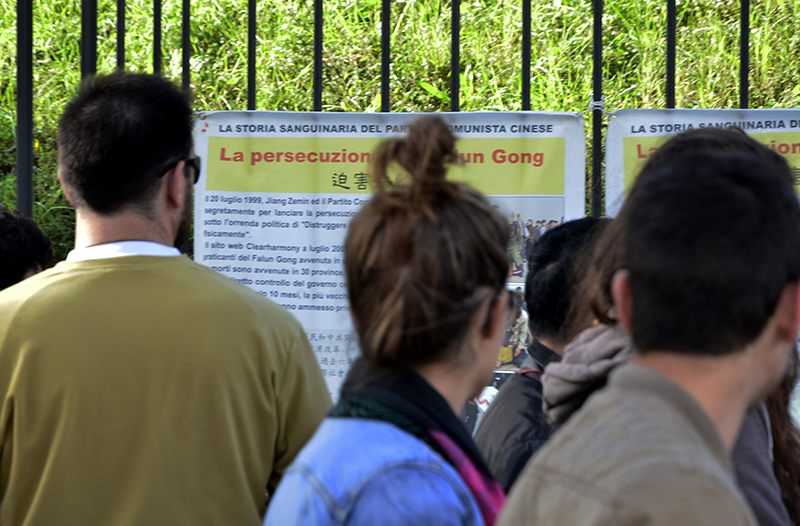 ![]() 图1-2:法轮功学员在罗马景点设置展板,传播真相 |