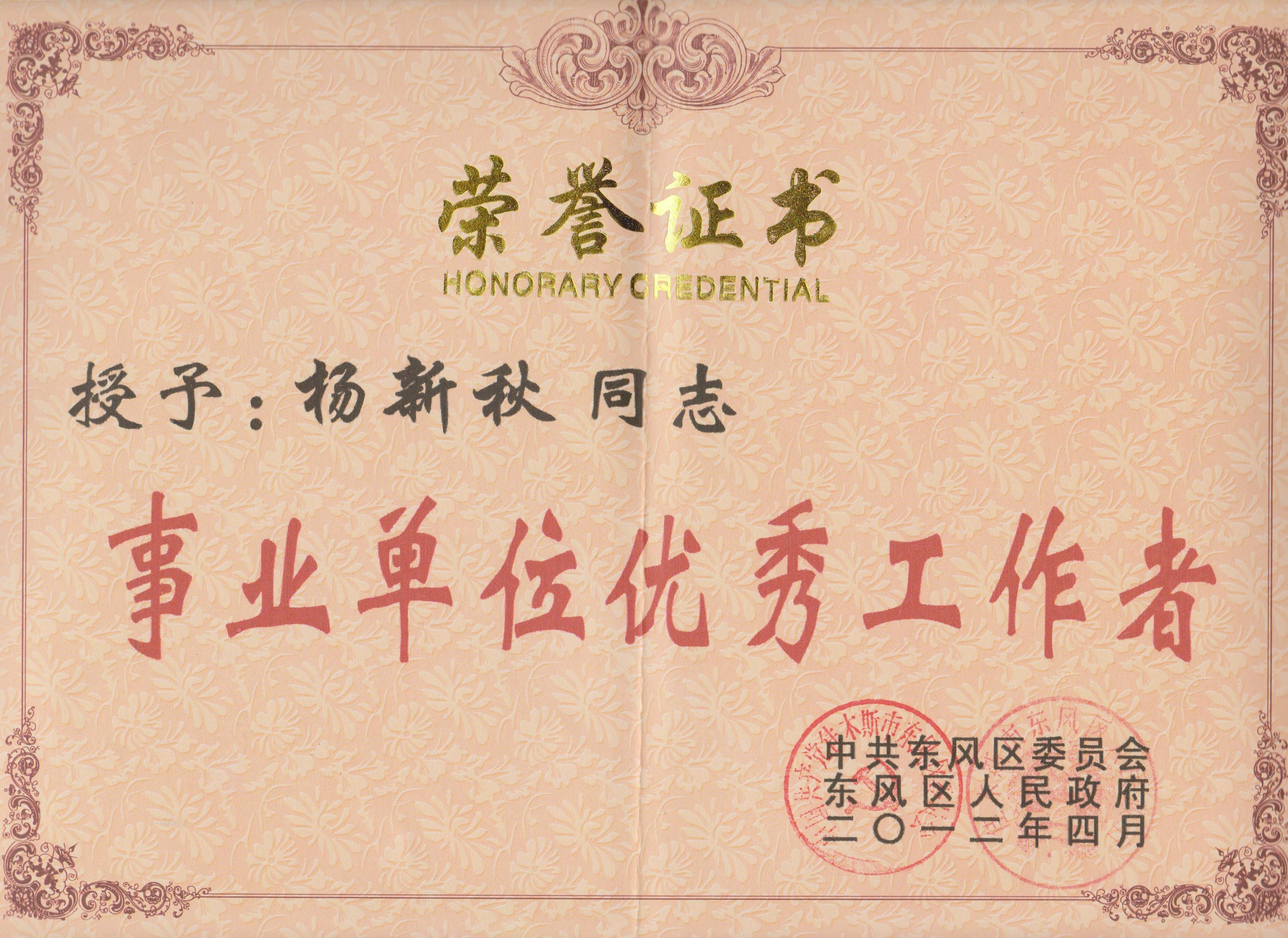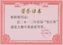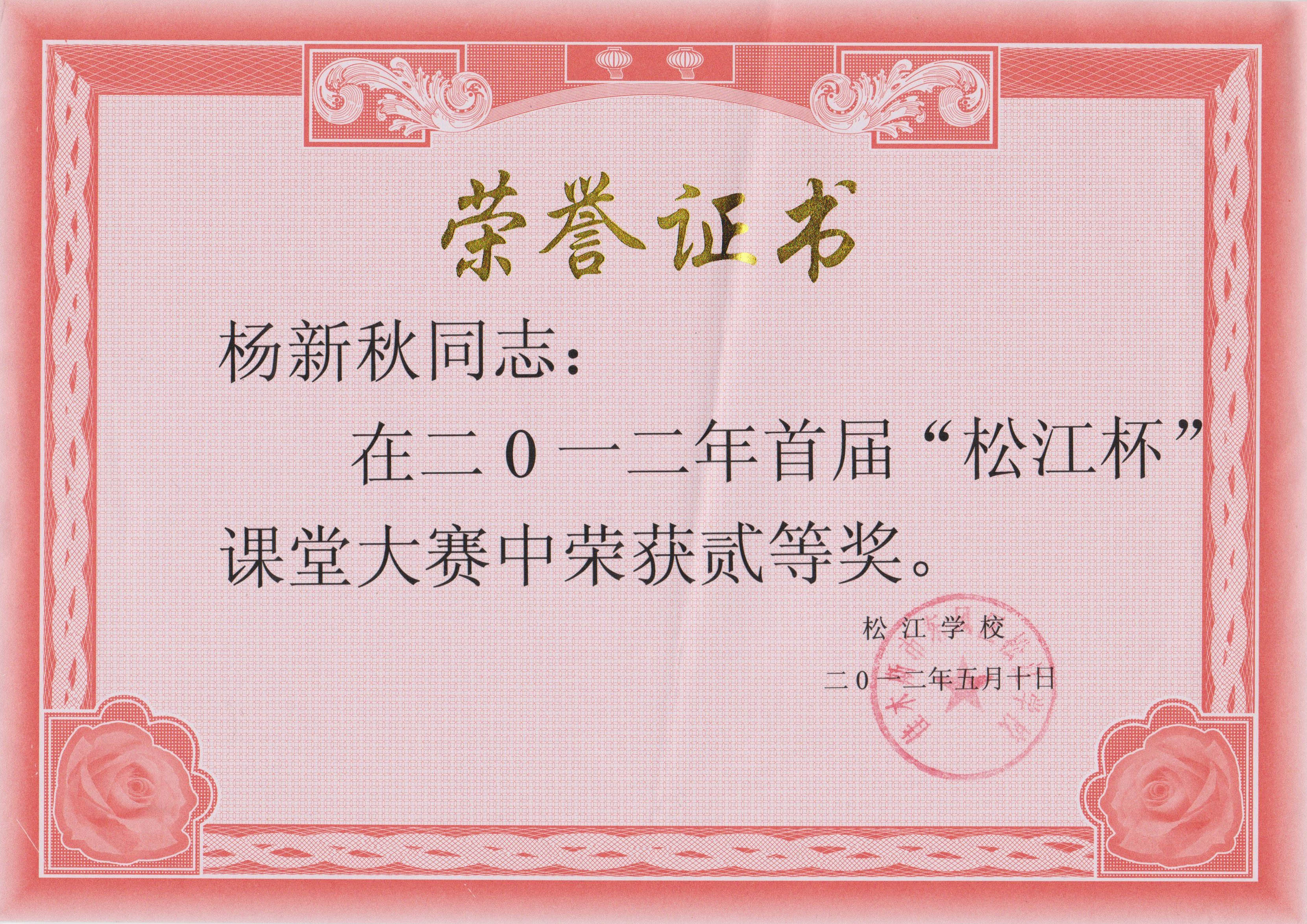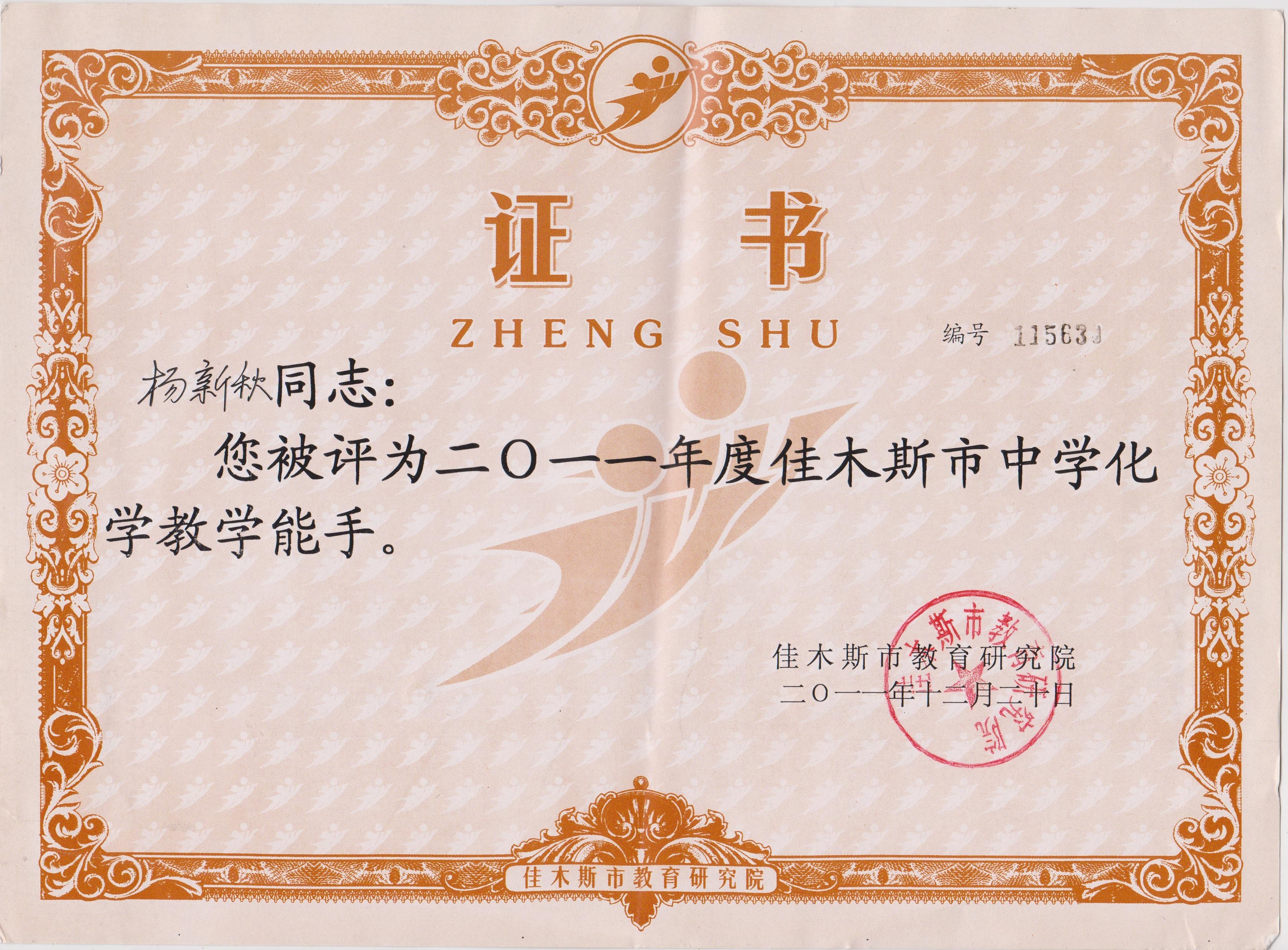 从近两年里他获得的荣誉,可以看得出,杨新秋不但人好,他还是教学能手。他曾获得“二零一二年首届‘松江杯’课堂大赛二等奖”、“二零一一年佳木斯市中学化学教学能手”、“单位优秀工作者”。