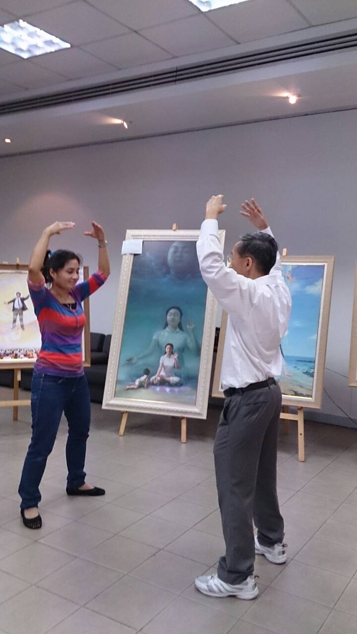 ![]() 泰国14 TULA纪念堂里,欣赏真善忍国际美展的观众当场学炼法轮功 |
