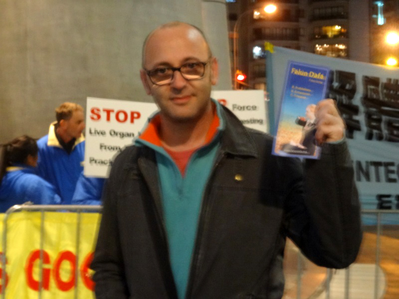 从西班牙巴塞罗那来新西兰才五天的国际留学生爱多德(Eduard)先生路过看到了横幅。法轮功学员给了他一份真相资料,并向他讲述了中共如何迫害法轮功,甚至活摘法轮功学员器官牟利的暴行。他听后十分震惊,说:“这太残忍了!邪恶到极致了!”他说回去将上法轮大法网站,下载西班牙语的《转法轮》阅读。他希望充分了解法轮功,他说:“我支持你们,希望你们成功反迫害!”