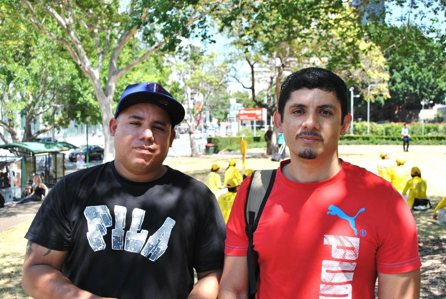 另外一对兄弟米尔顿•孔德(Milton Conde)和瑟吉欧•孔德(Sergio Conde)听说有法轮功的新闻发布会,特地过来参加。米尔顿是TAFE的学生,听闻法轮功学员所遭受的迫害后,他生气地说:“那是错的!如果有人想要为自身的健康做些什么,就让他们去做啊,不要忽视他们,给他们设障,应该要民主。”“(活摘)那真是错的!他们(中共)在侵犯人权。”“大家应该都来开始谈论这件事,联合对抗它。人们怕事,媒体不敢报导真实的故事……”