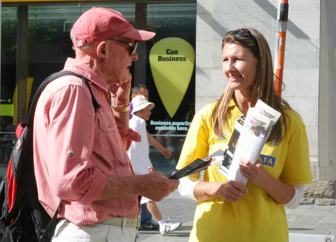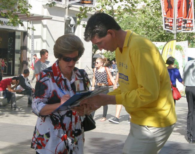 乔治•巴博萨(George Barbosa)是珀斯的卡波耶拉舞(Capoeira,一种巴西的独特舞蹈)教练,带了几十人在同一街道的另一个位置表演。他听完学员讲述中共如何大规模活摘法轮功学员器官贩卖牟利后,不仅自己签了名,还直接向学员借了征签本,拿了几十份资料,让参加当天表演的人都签了名。他对学员说:“谢谢你们告诉(我们真相),我们与你们在一起,世界需要关爱、善良和自由。”