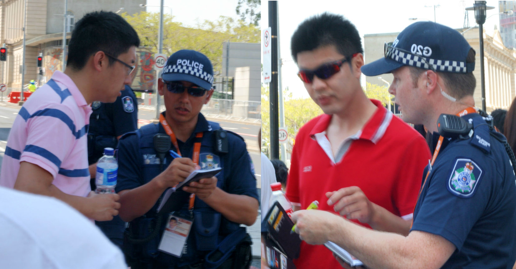 在习此行首站布里斯本,中领馆以每人每天一百澳元的价格,雇用中国留学生强行霸占法轮功学员数周之前即已申请获准的场地,想阻挡法轮功学员和平请愿。警察将他们赶至对街,不允许他们靠近法轮功学员的横幅点。为防他们扰乱滋事,警察还要求每一个参与者出示护照或驾照,一一登记个人信息。这些学生自识无趣,不久全部散去,只剩下几面中共血旗挂在封路的栅栏上。在距离峰会会场最近的横幅点,习的车队绕道路过时,警察们好心相助,让法轮功学员在更有利的位置和角度举挂“法轮大法好”和“停止迫害法轮功”等横幅,使车队看清,明确地将心声传递出去。