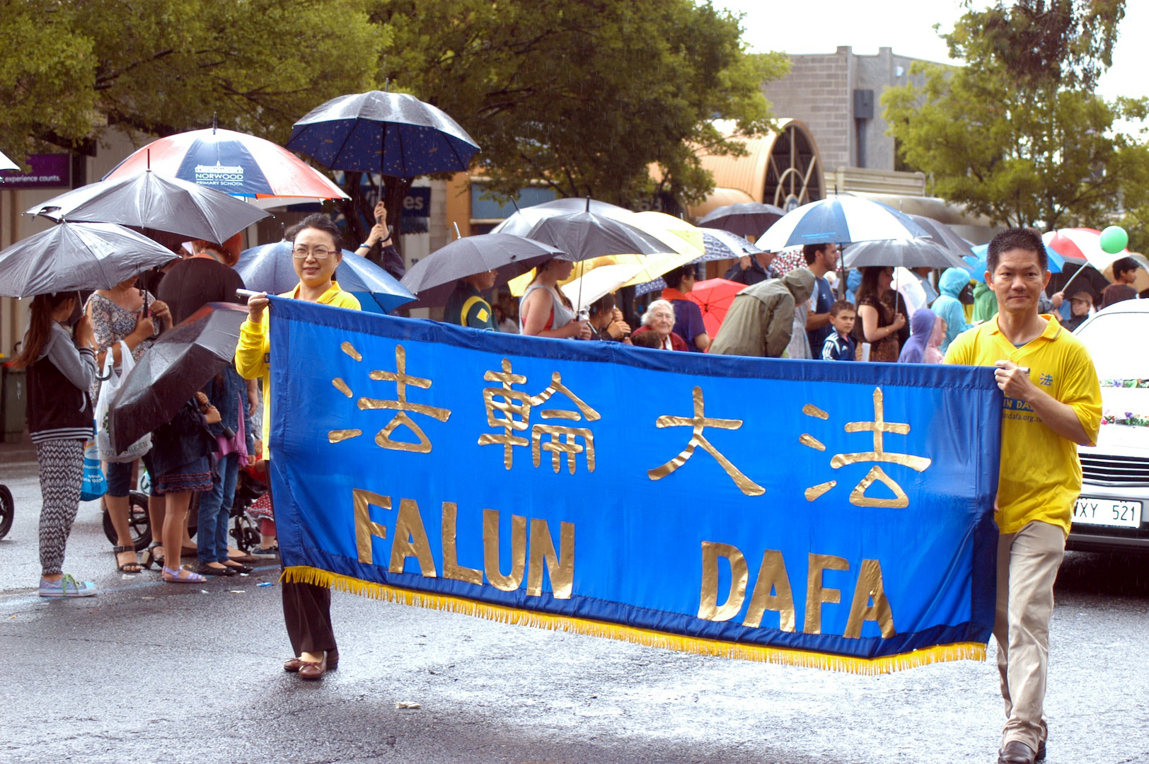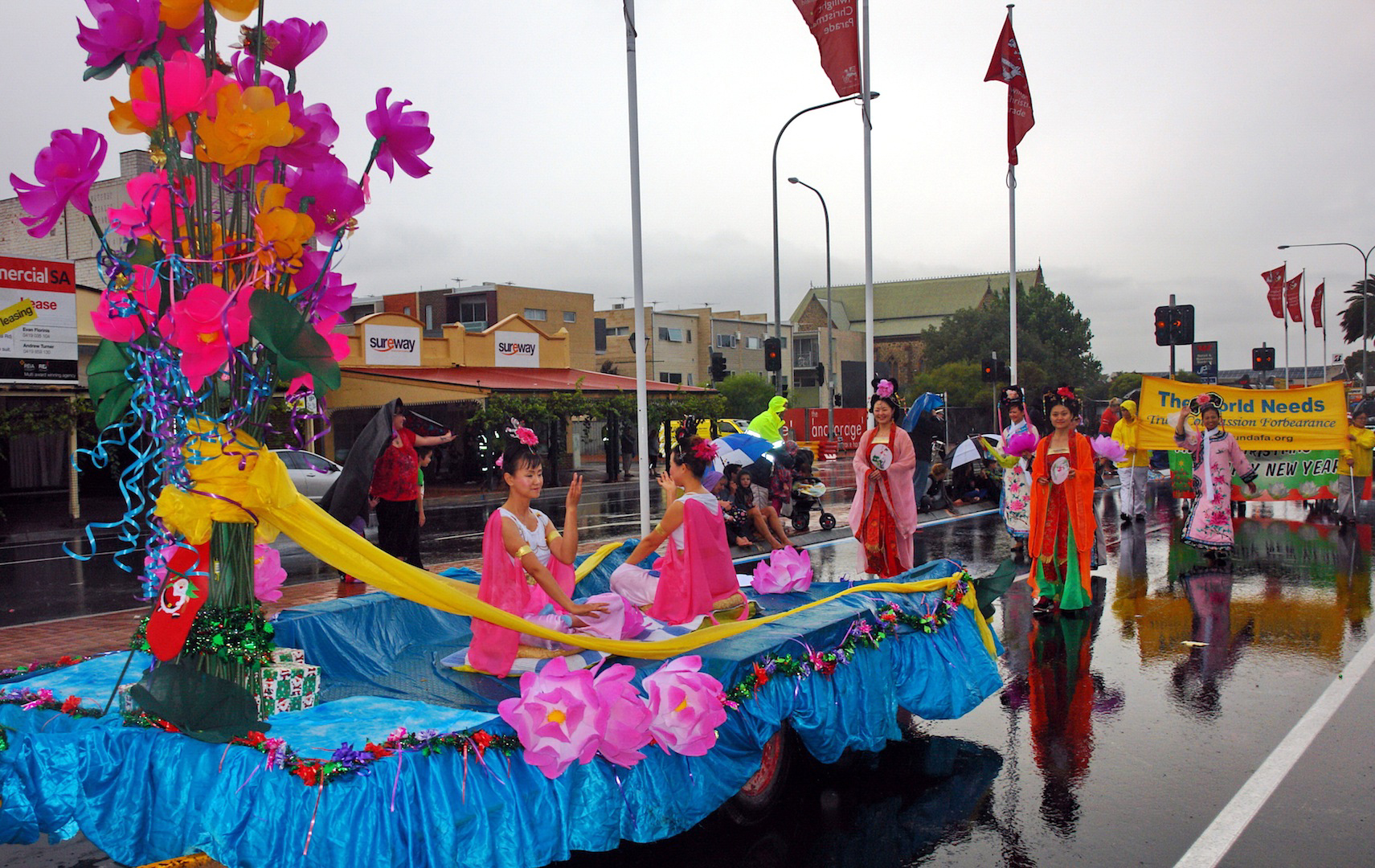二零一四年十一月十五日和二十二日,南澳法轮功学员参加了阿德雷德港(Port Adelaide)和诺伍德(Norwood)市的圣诞花车游行。这两个游行日虽然都下着雨,但学员们依然如同往年一样积极参与。身着唐装、仙女装的学员,虽然衣衫单薄,风雨中依然笑容灿烂。学员们随着歌曲《法轮大法好》的优美旋律,步履稳健,心态祥和,把修炼大法的美好带给世人。成千上万的观众在道路两旁兴致勃勃的观看,风雨没能影响欢愉热烈的氛围,人们互相祝福道谢。