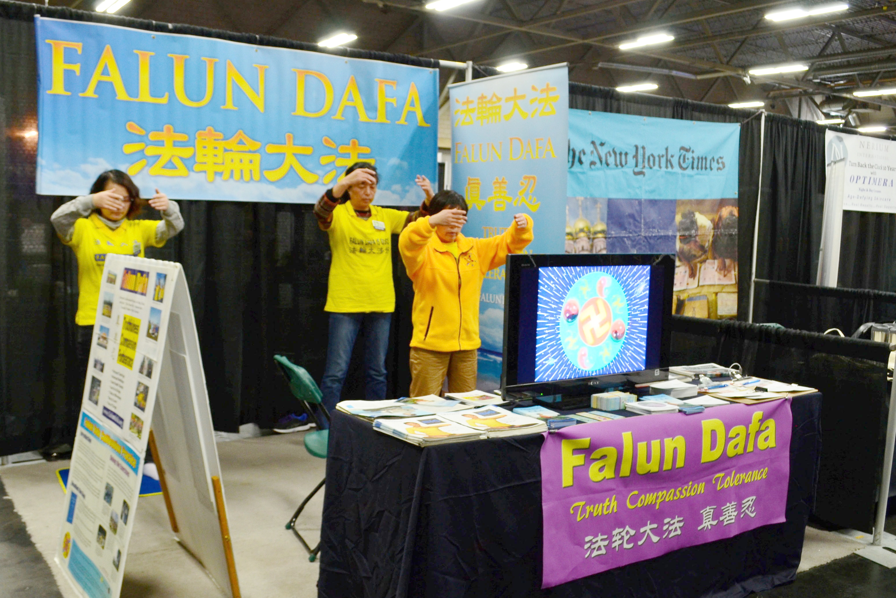 在近百家参展单位中,介绍法轮大法(又称法轮功)的展位是唯一一个免费教功的非商业性质展位。法轮大法的祥和、宁静,其“真、善、忍”法理和提高身心健康的奇效吸引了许多参观者驻足,纷纷询问具体的修炼方法。法轮功学员向参观者介绍简单易学的功法和以“真、善、忍”为指导的修炼原理,并进一步向参观者讲述了中国正在发生着的迫害事实,中共活体摘取法轮功学员器官的罪恶。许多明白真相的参观者感到震惊,都主动在请愿书上签名,呼吁加拿大政府谴责中共活摘法轮功学员器官的暴行、帮助停止迫害。