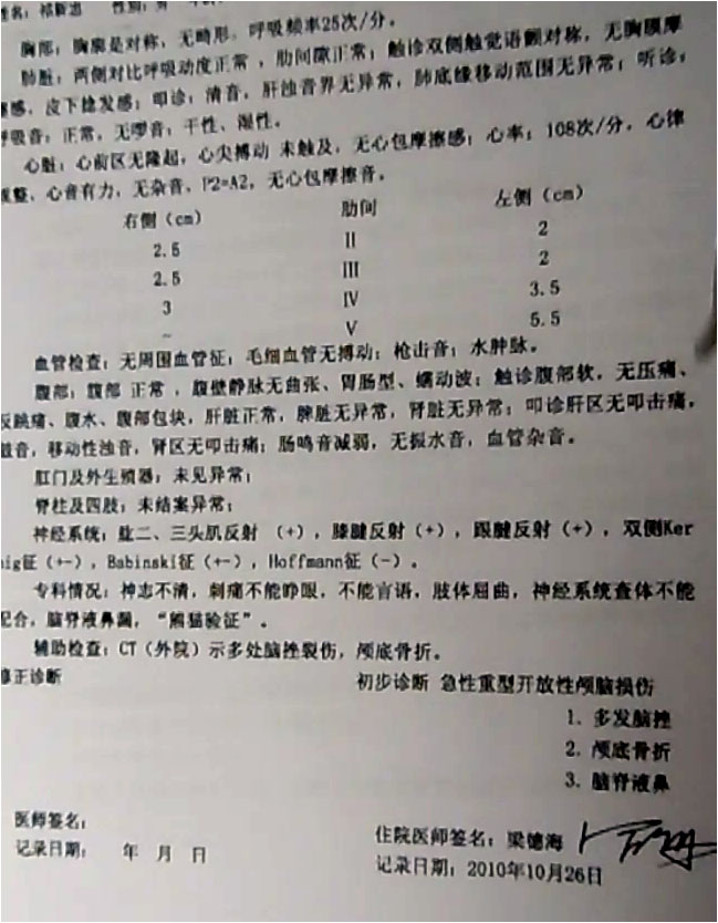 等到了南皮县医院检查结果显示:脑部11处骨折,胳膊多处骨折,颈椎严重损伤,肋骨挫伤插伤肺部,眼眶骨折,眼球线也断了,牙床撞折还掉了一颗牙。医生看结果后就通知我们说:人已经不行了。