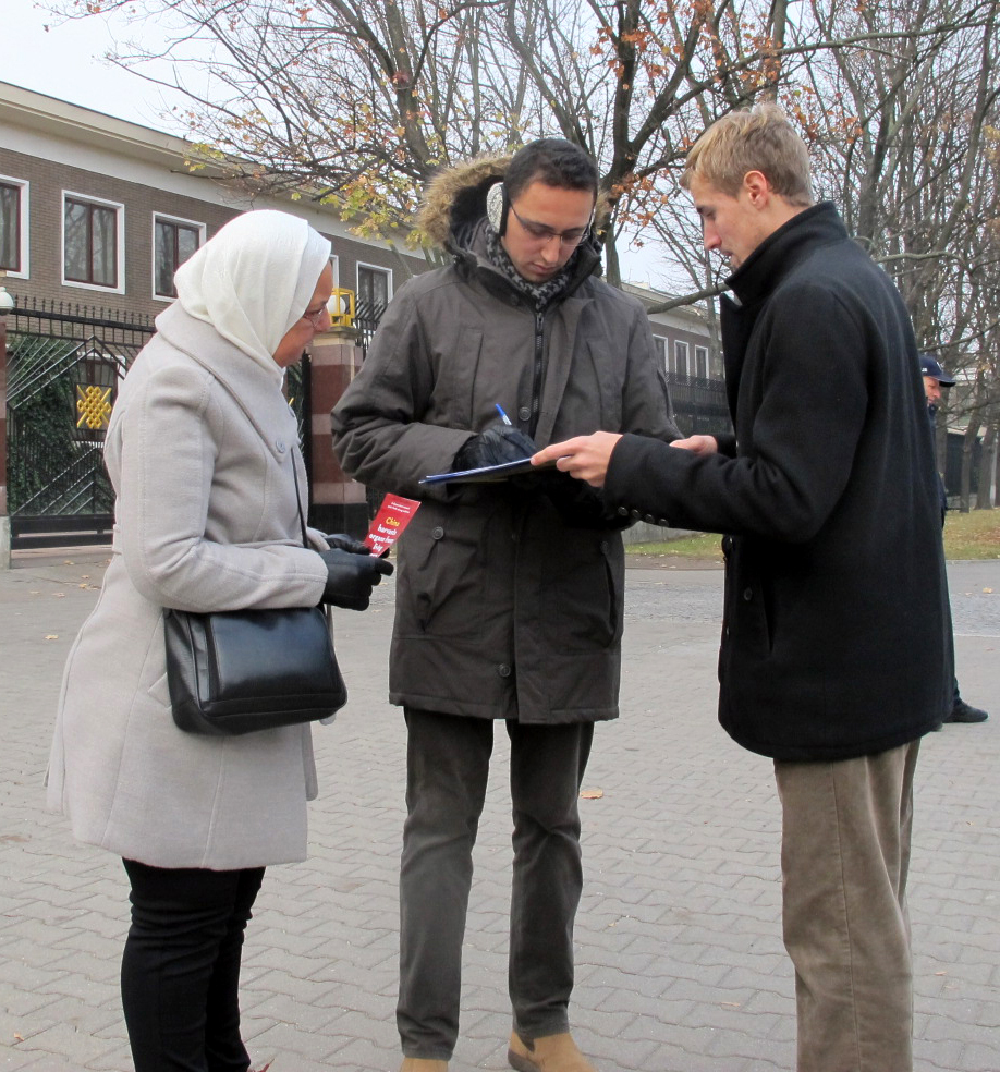 一对夫妻路过中使馆,看到法轮功真相展板后,双双在反对中共活摘器官罪行的征签簿上签名。