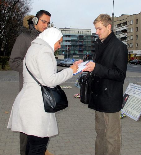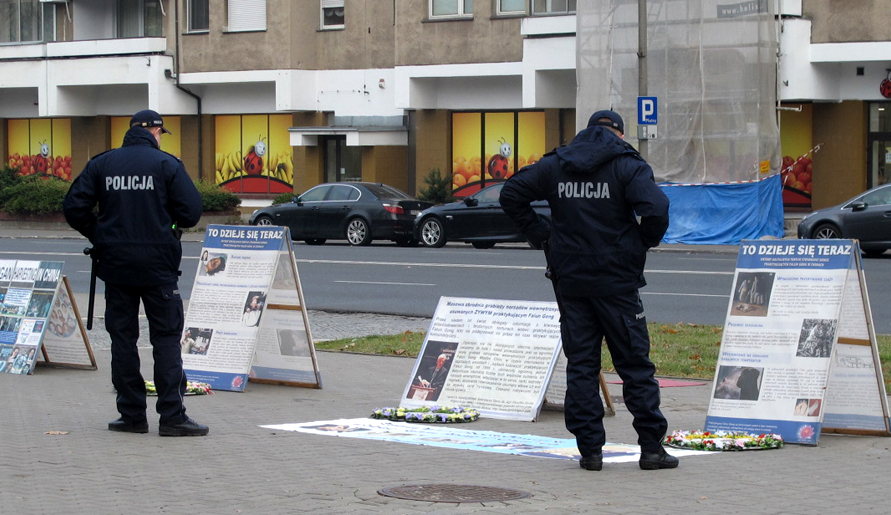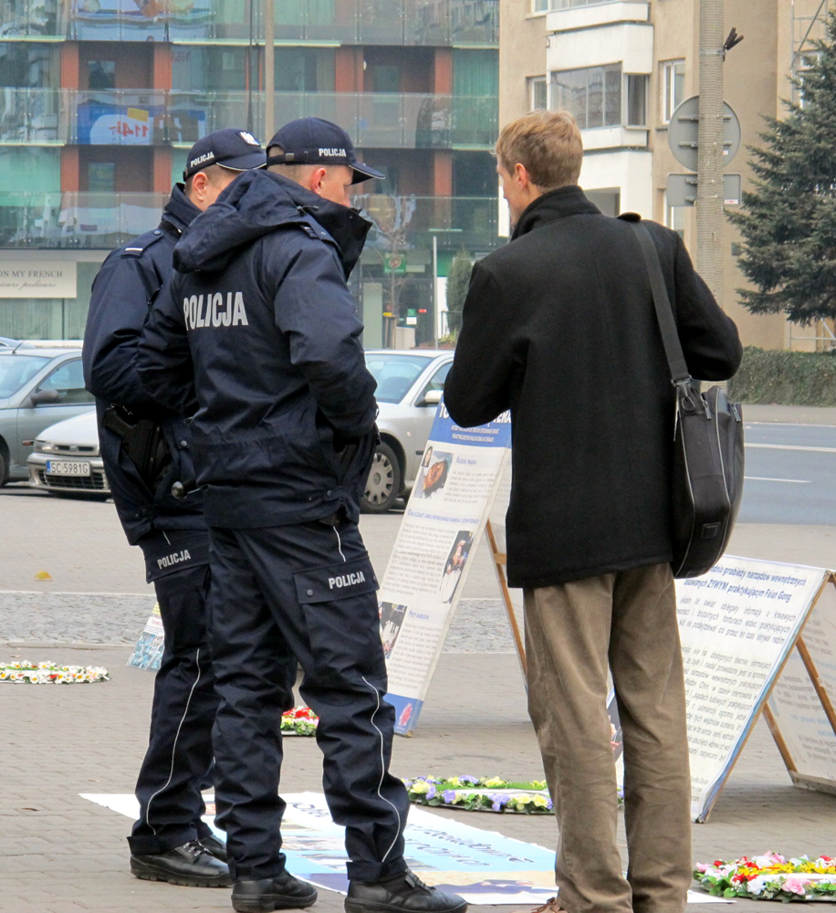 当一幅幅真相展板摆放在华沙中使馆门前时,首先受到当天执勤警察的注意,他们是第一天来此工作,当看到中共对法轮功学员的残酷迫害,特别是活摘修炼人器官出售的罪行使他们内心感到无以言表的震惊,他们十分详尽地询问了很多问题并逐幅阅读法轮功真相展板,最后将法轮功真相传单装入口袋说:“我们会上网更多了解法轮功,谢谢你们,祝福你们,支持你们!”