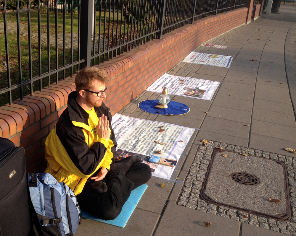 同天,一名法轮功学员独自来到格但斯克中领馆门前静坐,他首先将几幅法轮功真相条幅摆放在领馆墙外,并向过路的行人发放真相传单,又在中领馆的邮箱中放入大.纪.元;专刊《·九·评*共产党》后,他点燃一支蜡烛,静静地坐在那里,三个小时过去了,执勤警察为他坚持真理行为所感动,破天荒地将他的静坐拍照下来,路边的出租车司机也由衷敬佩他的正义行为,主动邀请这位学员到车里喝茶,虽然只有一个人,但是路上过往车辆鸣笛致敬,大量自行车道上的骑车人停车观看法轮功真相条幅,不断听到祝福和支持的声音。