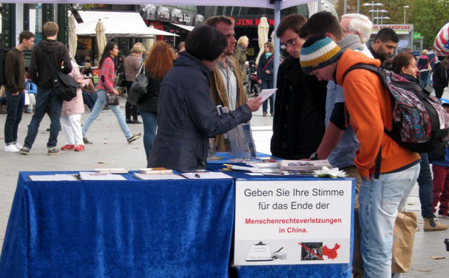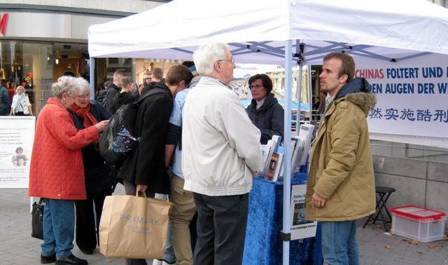 一些人在我们的展台给我们讲述了他们的经历。其中一个人是名外科医生,他问我们什么是法轮功,为什么我们在这里开设展台。在他的问题得到回答并明白了我们在这里发传单的目的后,他给我们讲述了他的一次经历,他曾和一个中国同事一起在器官移植部门工作过,一次这名中国同事问到德国执行枪决的刑场在哪儿?这样的问题让他很震惊。