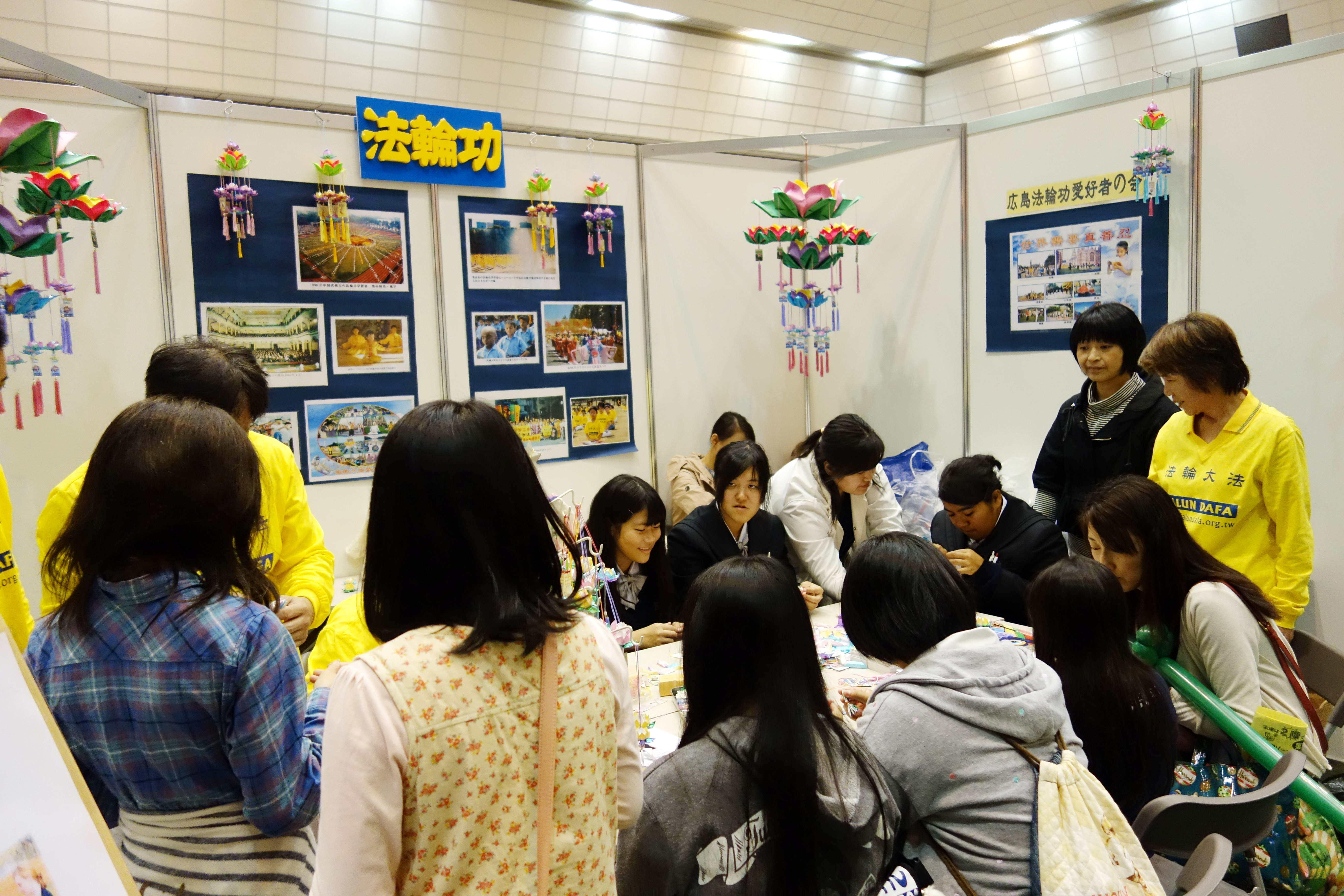 法轮功展位被来场者挤满,人们学折纸莲花并聆听介绍法轮功